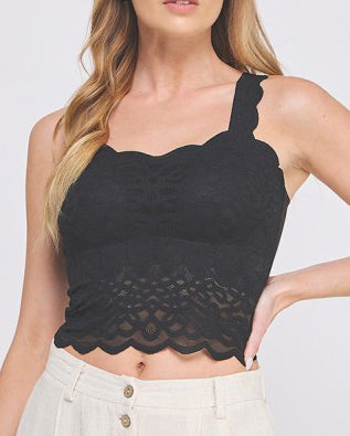 This pretty bralette combines expert craftsmanship with elegant design. Crafted from delicate lace with scalloped edges, this padded bralette tank provides subtle shaping and gentle support. Its refined construction ensures a comfortable fit, making it ideal for layering or standalone wear, bringing sophistication and functionality to your lingerie collection.
