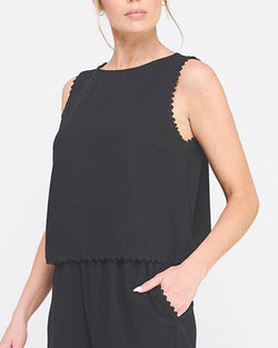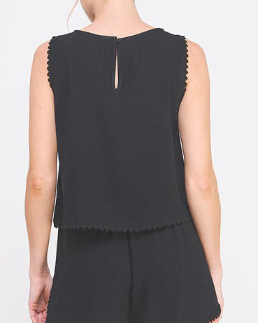 This soft linen blend top features a sleeveless silhouette with a crochet lace trim. A wardrobe staple to style with everything from shorts to jeans to skirts.