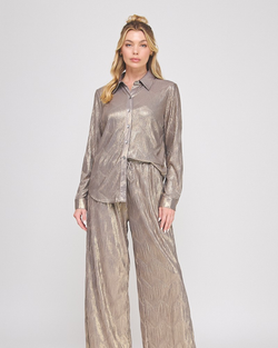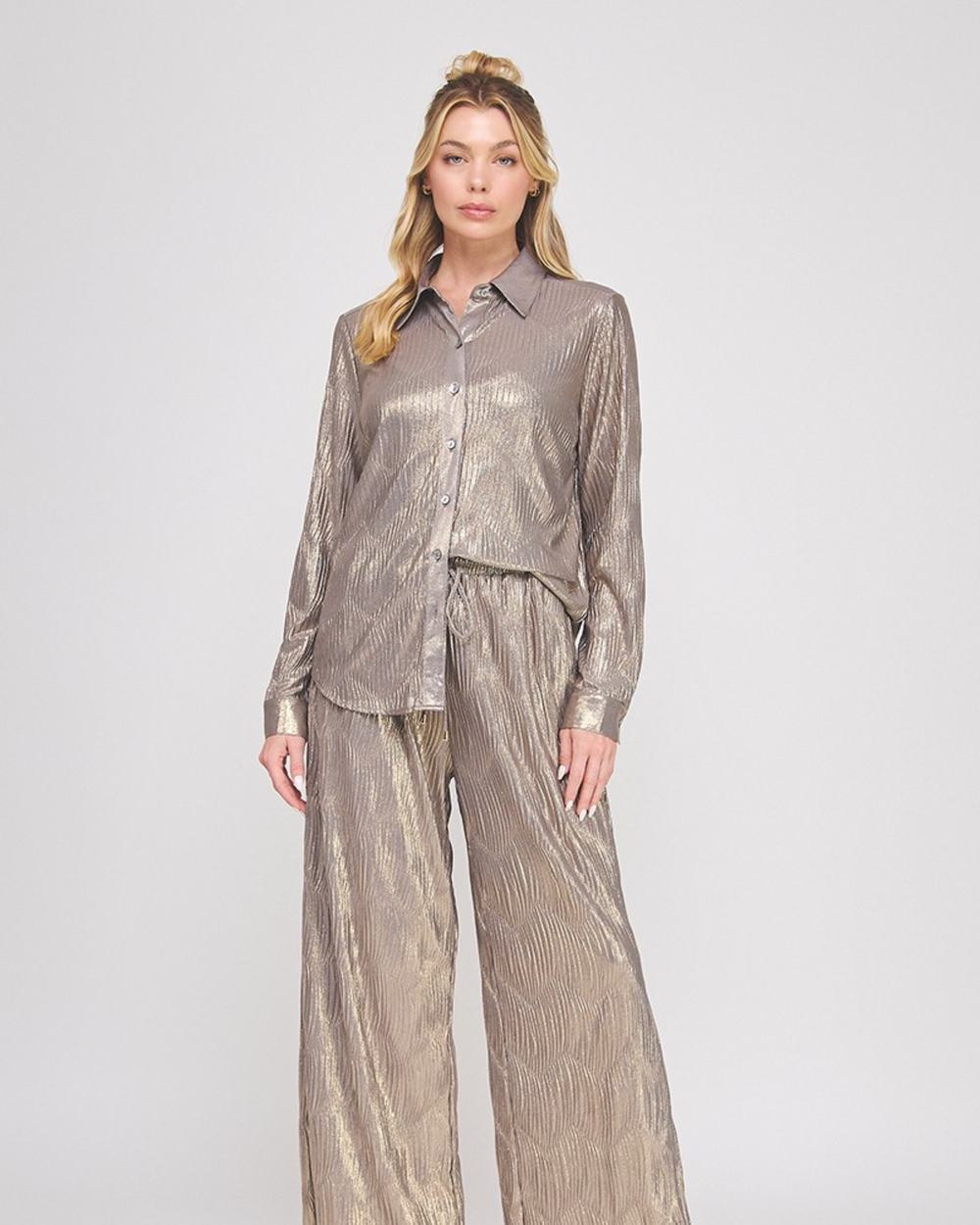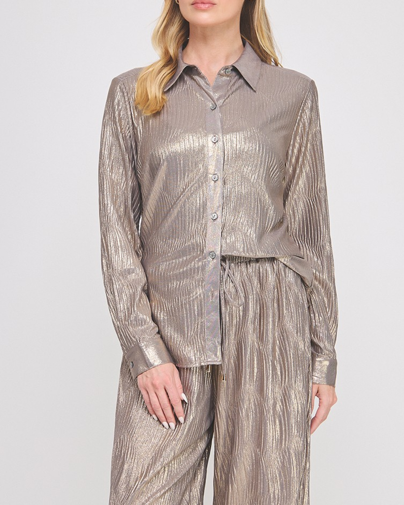 Add a splash of sparkle to your look with this Shimmer Long Sleeve Top in Champagne Gold—where comfort meets glam! Perfect for turning heads day or night, it’s your new go-to for effortless shine.