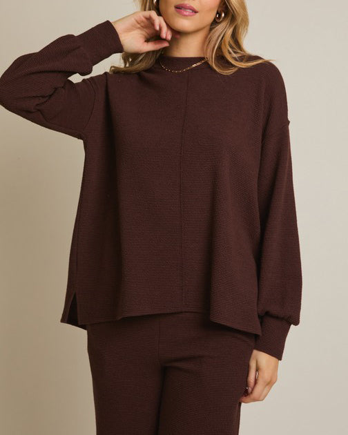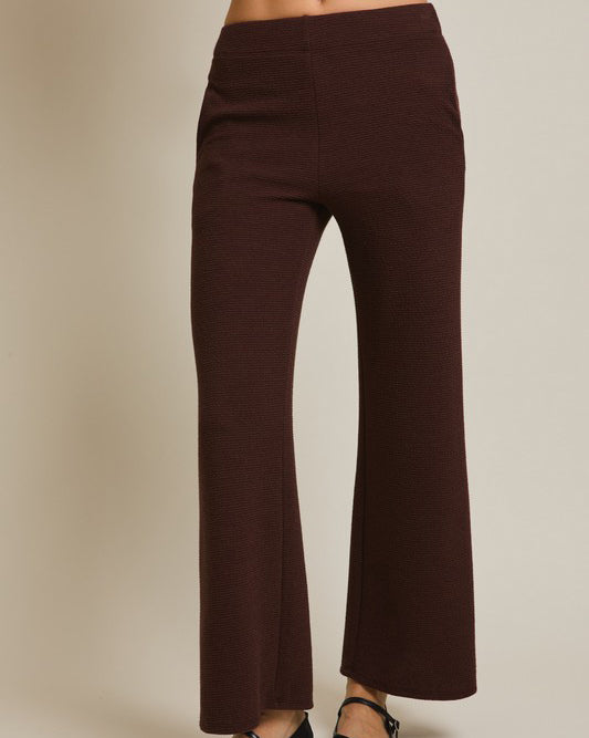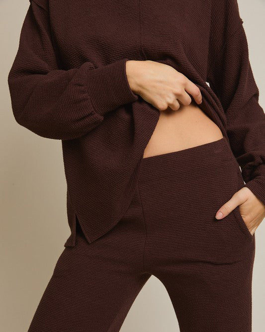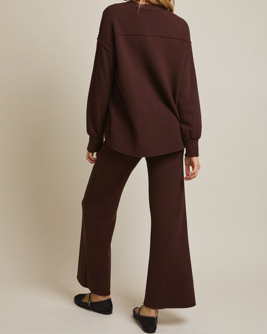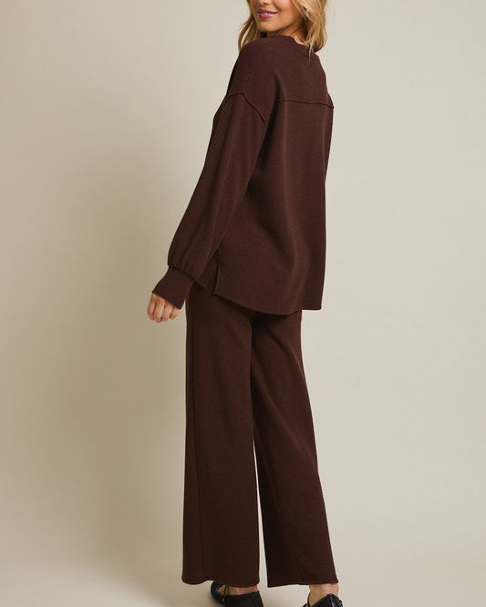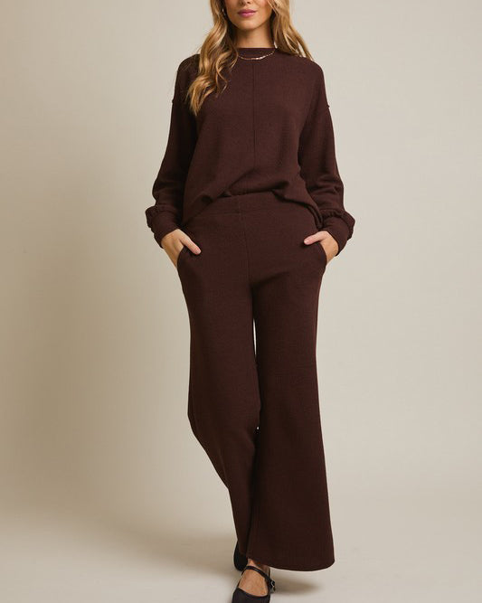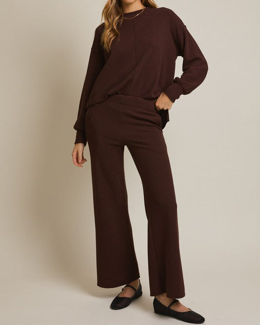 This soft and comfy set features a round neckline top and flare hem pants. Soft to wear for lounge days, but polished enough for day outings.