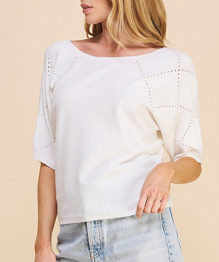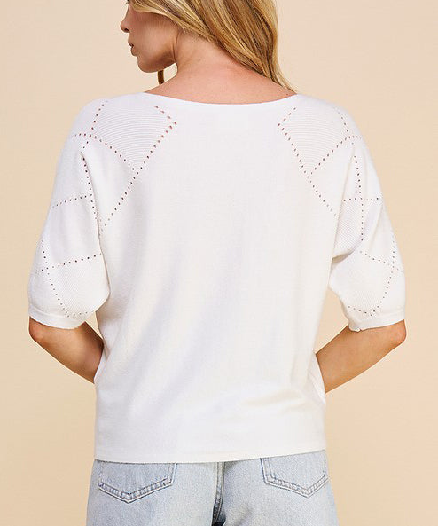 This soft short sleeve top features diamond pointelle detail and dolman sleeves. Lightweight and comfortable, this fine gauge top is a must for work or play.