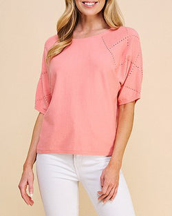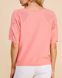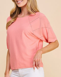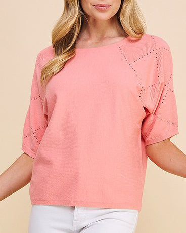 This soft short sleeve top features diamond pointelle detail and dolman sleeves. Lightweight and comfortable, this fine gauge top is a must for work or play.