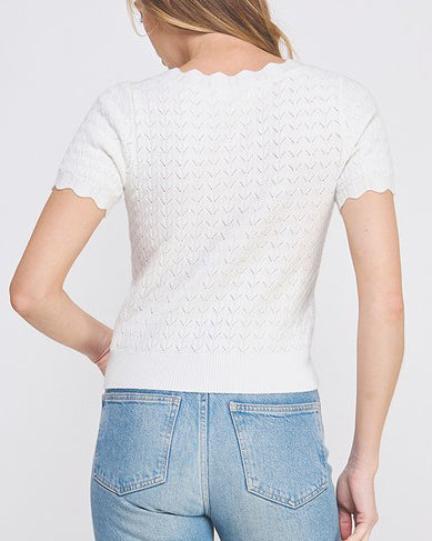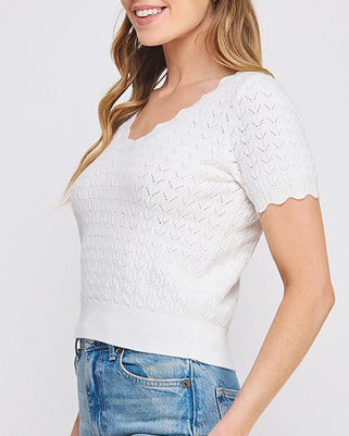 This soft pointelle knit top features a v-neckline, short sleeves and scallop edges. A wardrobe staple for work or play.