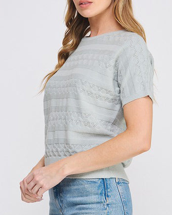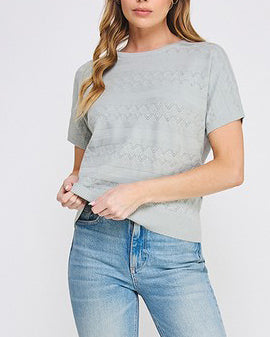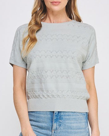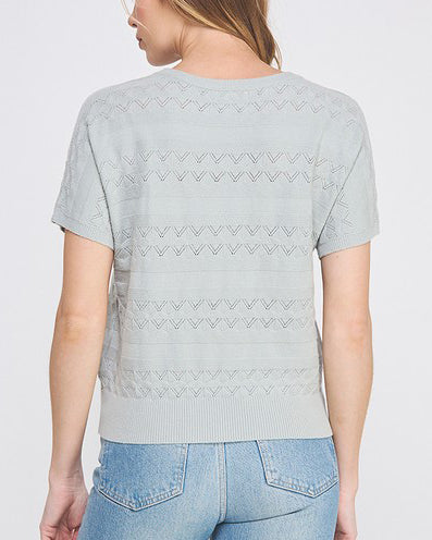 This soft knit top features a pointelle pattern and short sleeves. Lightweight and comfortable, this is versatile top for everyday wear.
