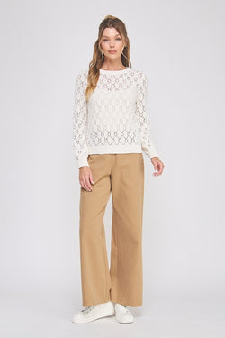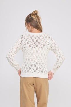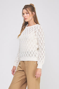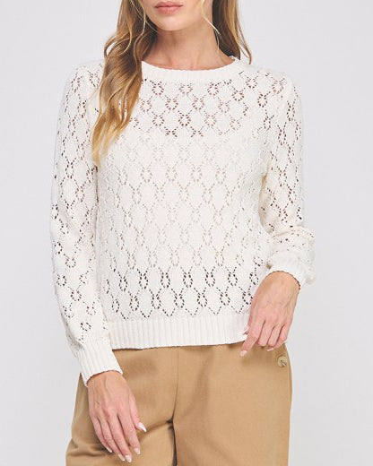 Elevate your fall wardrobe with this chic sweater top. Crafted for softness and comfort, its intricate diamond pointelle pattern adds refined texture while maintaining a lightweight feel. Perfect for layering or wearing solo, this elegant sweater offers understated sophistication and cozy warmth as the seasons change.