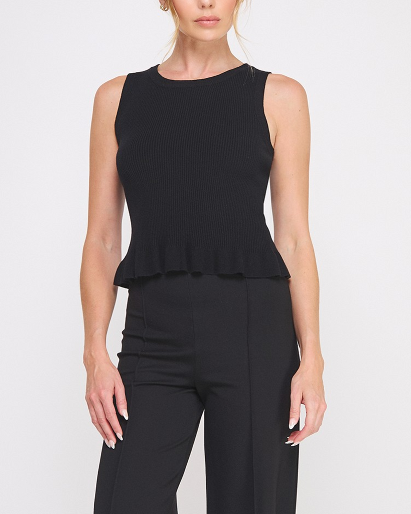 This soft rib-knit peplum tank combines cozy comfort with a flirty flare—perfect for sunny days or layering fun.