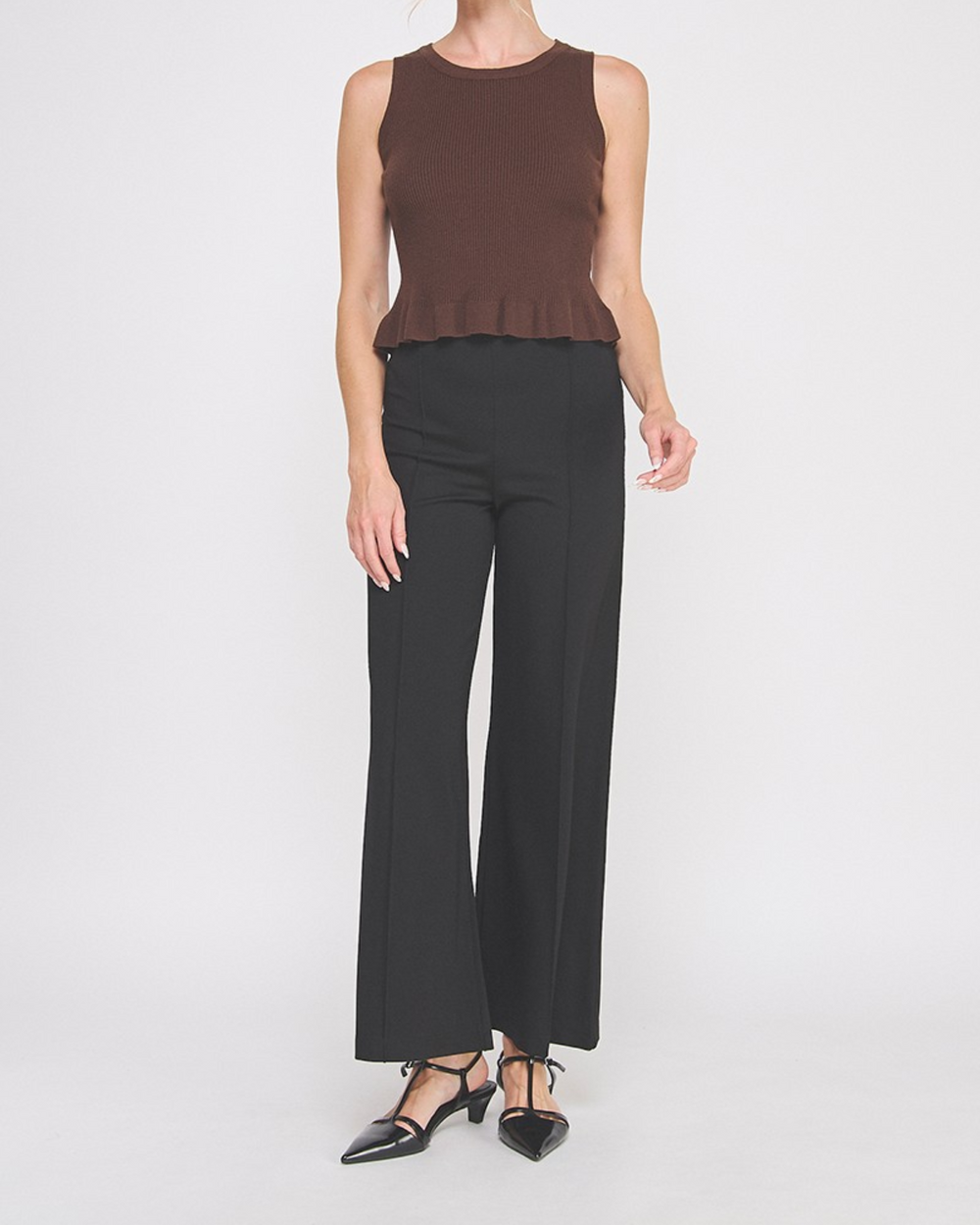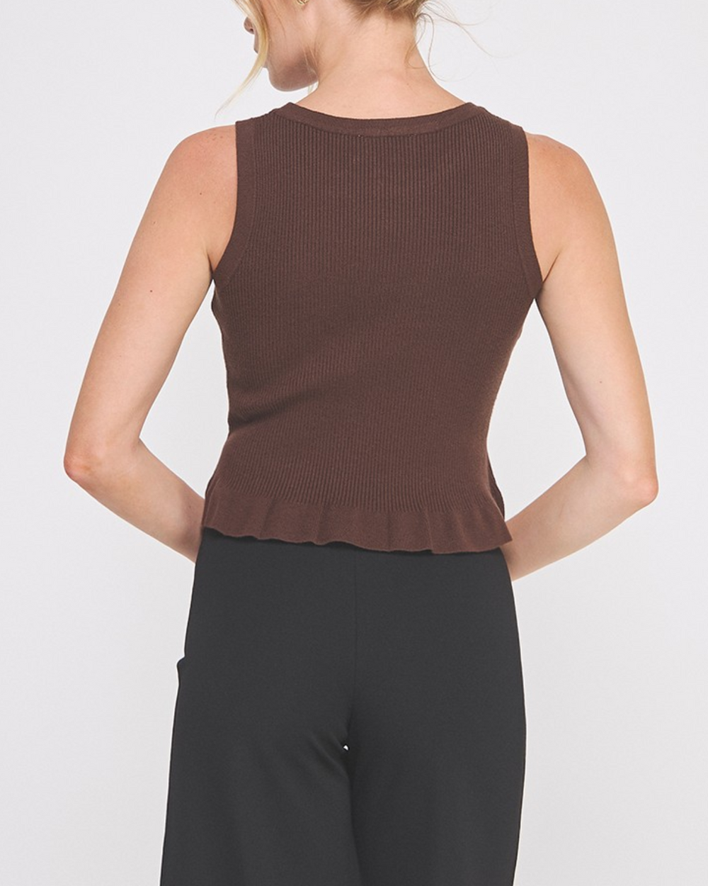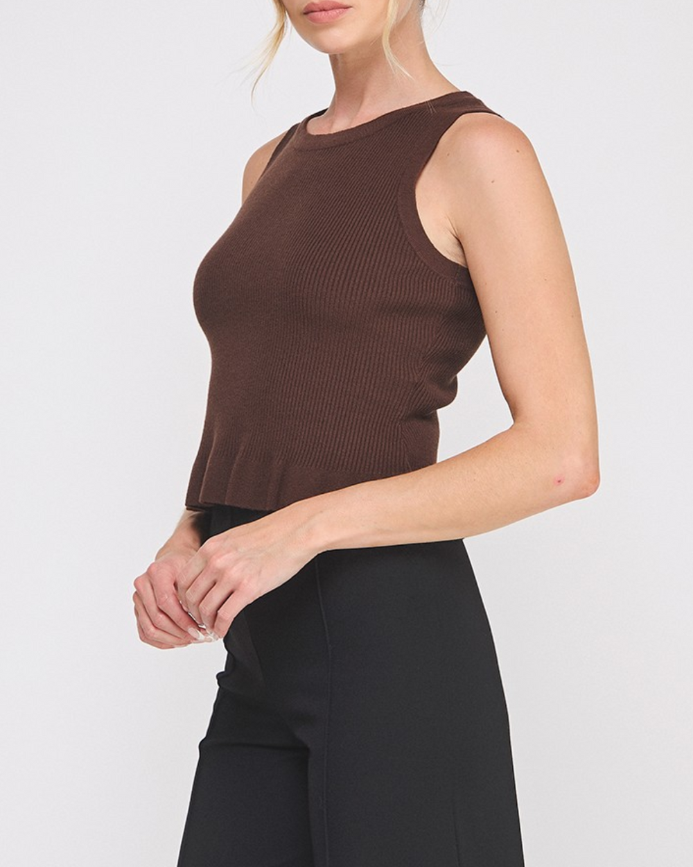 This soft rib-knit peplum tank combines cozy comfort with a flirty flare—perfect for sunny days or layering fun.