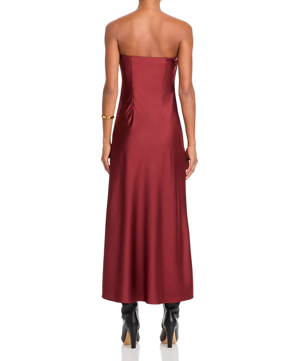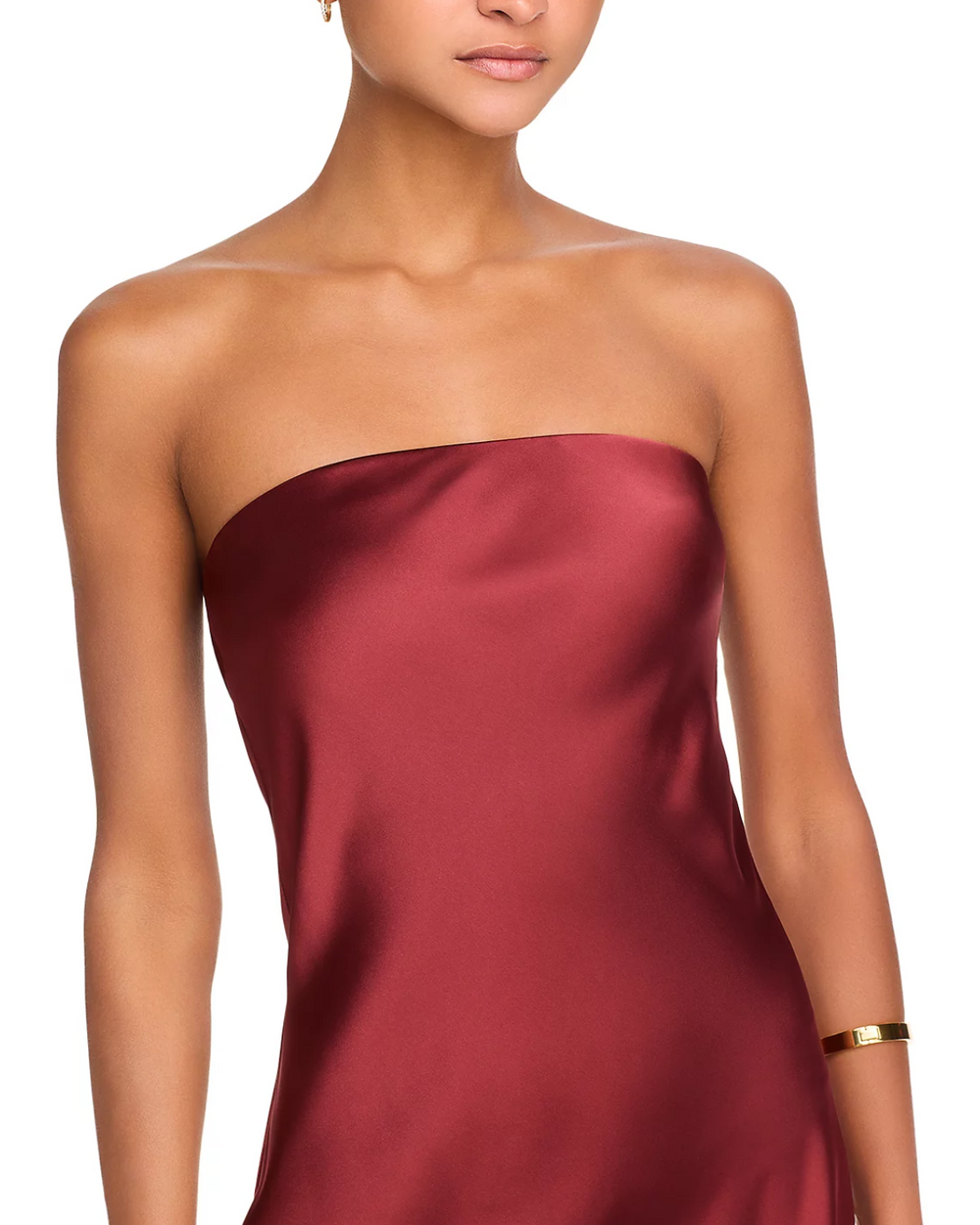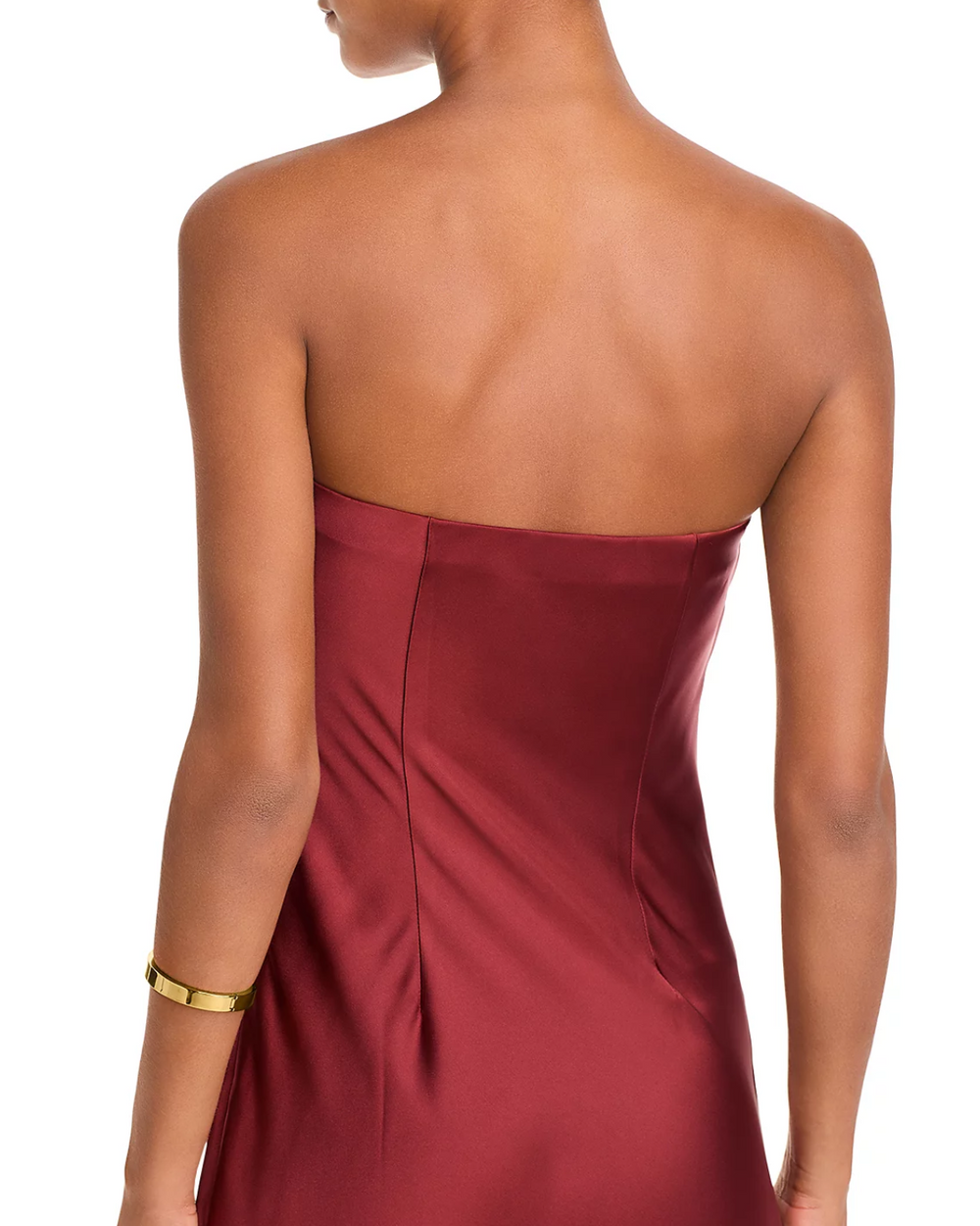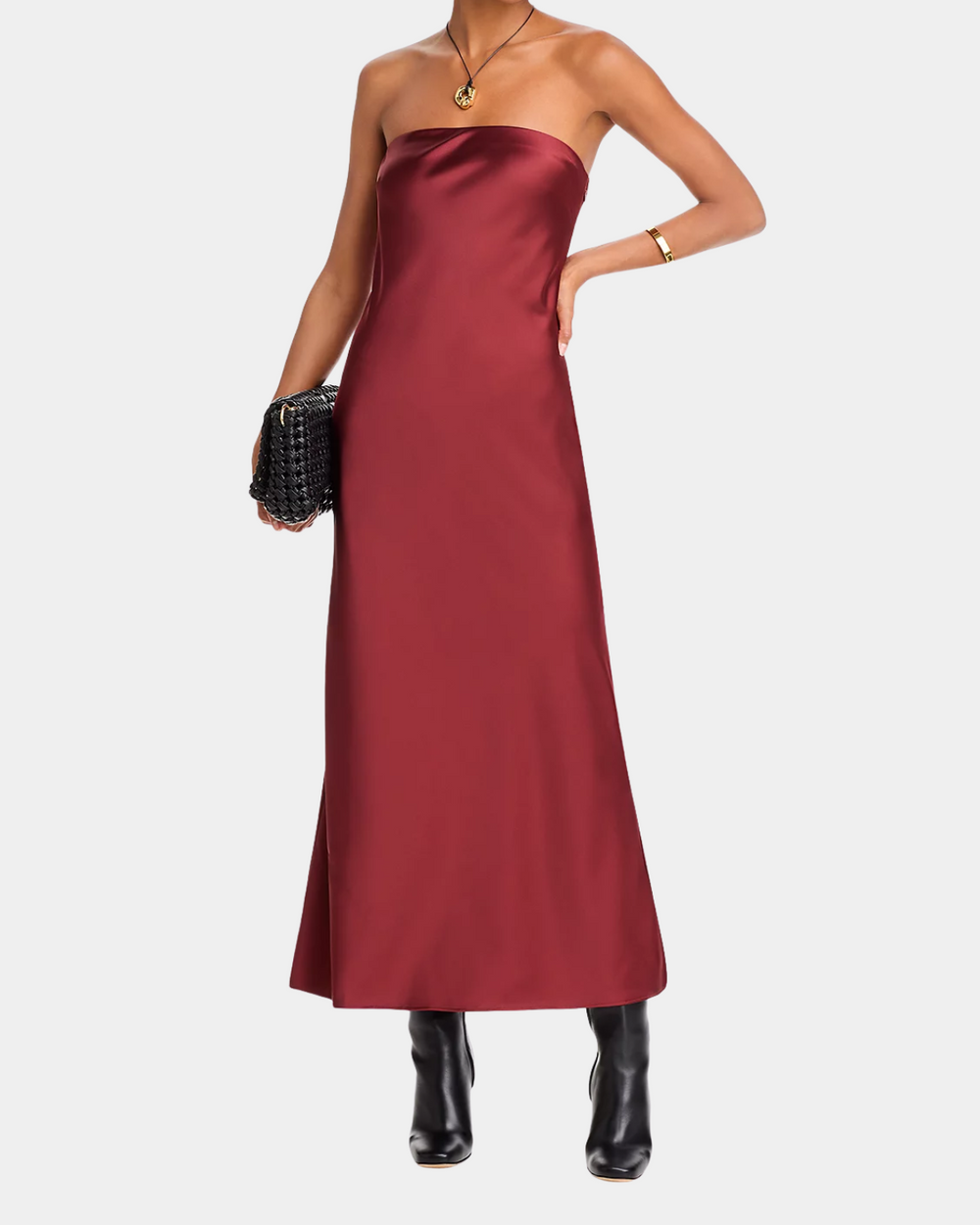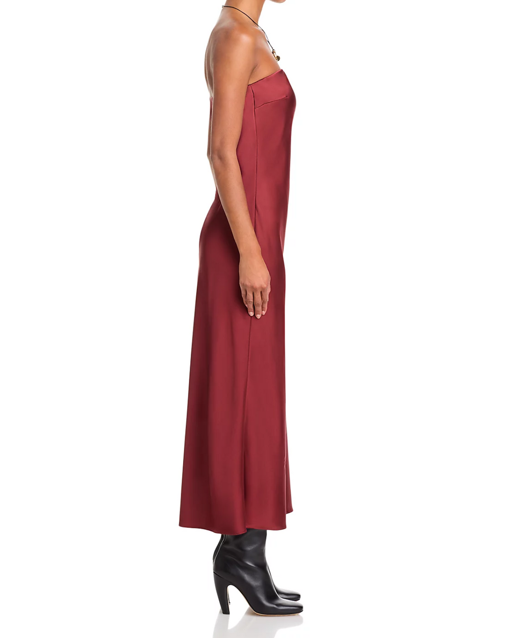 The Steve Madde Jessamine Dress in dark red features a slip silhouette that gracefully skims the waist and hips, crafted from luxurious satin charmeuse fabric for an effortlessly elegant look. Perfect for making a refined statement at any evening occasion.