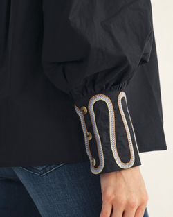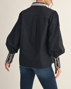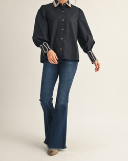 Add a splash of fun to your wardrobe with this button-down shirt featuring charming stripe accents on the sleeves and neckline. Its playful embroidery details make it an easy pick for brightening up any outfit.