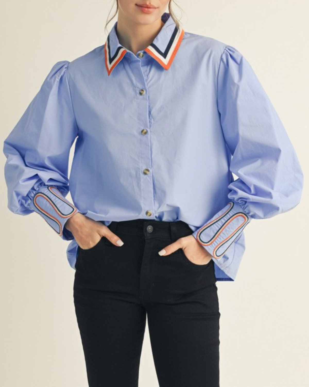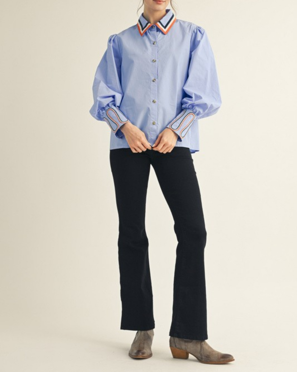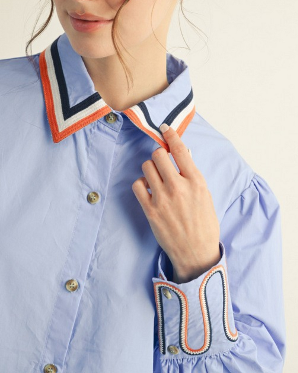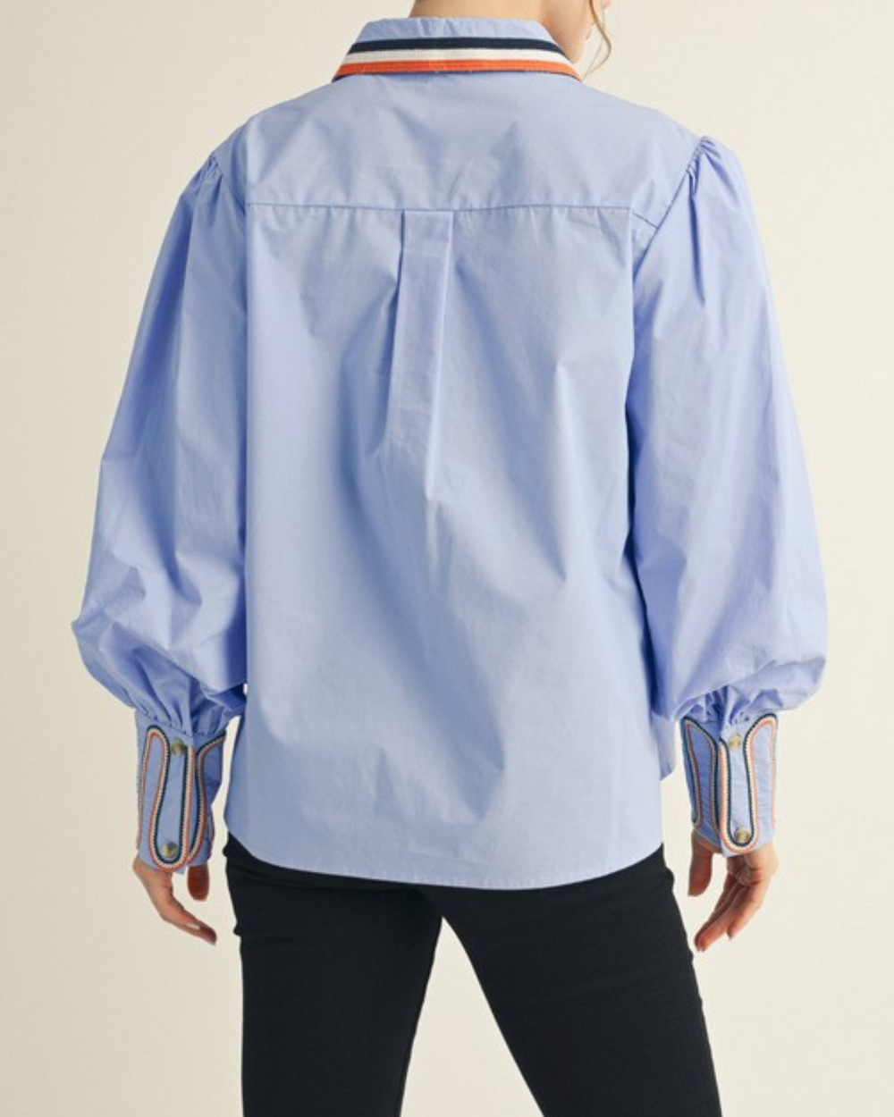 Add a splash of fun to your wardrobe with this blue button-down shirt featuring charming stripe accents on the sleeves and neckline. Its playful embroidery details make it an easy pick for brightening up any outfit.