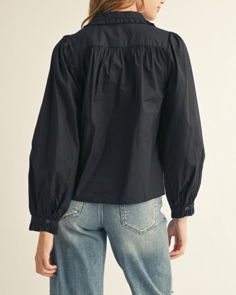 Add a flirty touch to your wardrobe with this long sleeve top featuring charming ruffle accents and buttons.