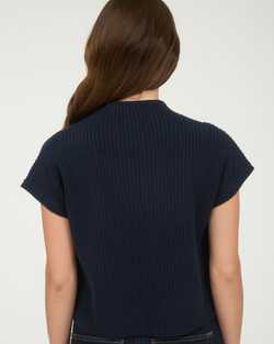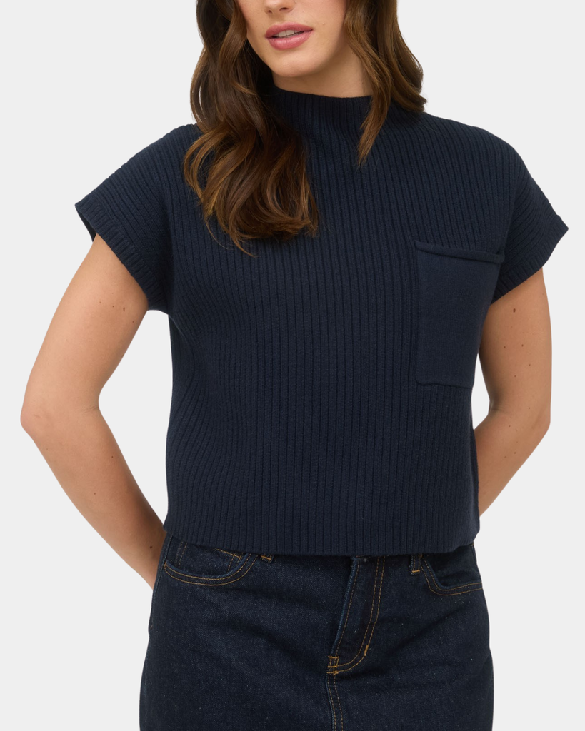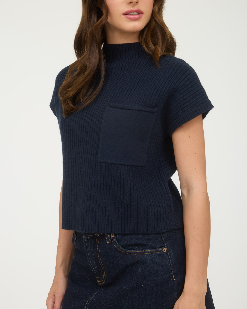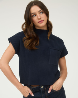 A polished ribbed sweater top in denim blue, featuring textured knit detailing and a functional front pocket. Versatile enough to layer or wear alone, it bridges casual and refined styling with understated sophistication.