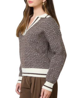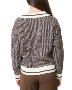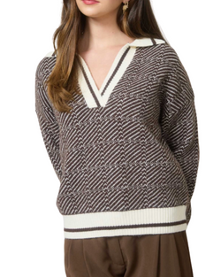 This brown pullover brings playful vibes with bold geometric stripes and a classic V-neck collar for extra flair. Perfect for adding a twist to your everyday cozy style.