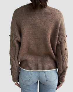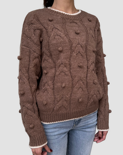 Cozy up in this brown cable knit sweater dotted with charming details and a playful contrasting hem. It’s the perfect mix of classic comfort and a fun twist.