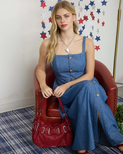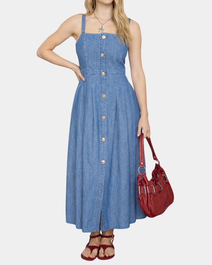 Rock that denim-on-denim vibe with this sleek button-down midi dress! No sleeves means maximum styling freedom—throw on a jacket, crop top, or leather vest to make it totally yours.