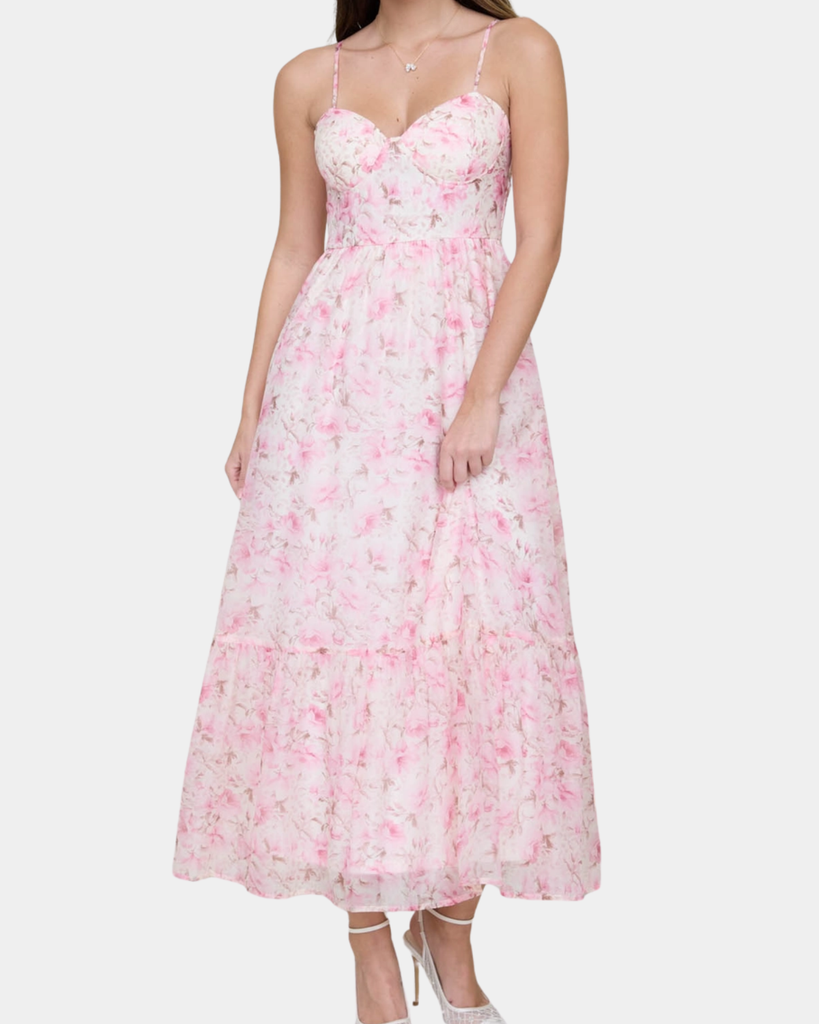 Bloom where you're planted in this delightful floral corset midi dress! Spaghetti straps frame your shoulders while the structured bodice creates a flattering silhouette. The vibrant pink and multi-colored floral print brings instant joy to any occasion.