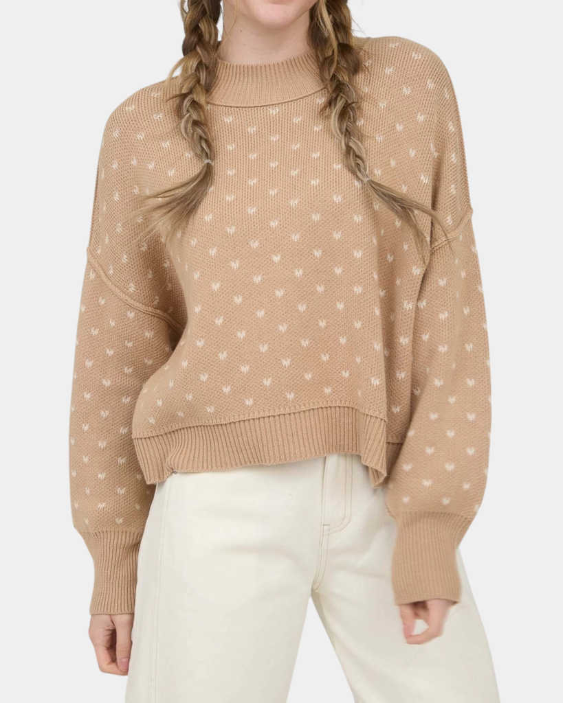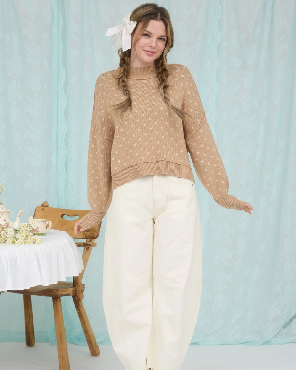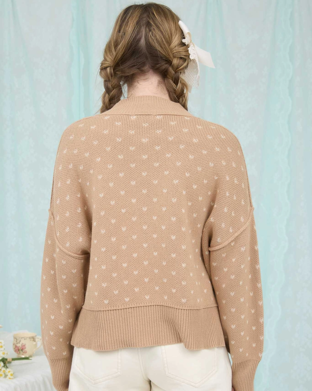 Cozy up in this adorable khaki sweater featuring an all-over heart pattern that's sure to spread the love. Perfect for layering or wearing solo, it's the sweetest way to add warmth and charm to your everyday wardrobe.