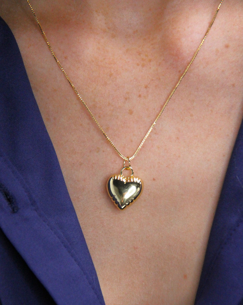 This on trend gold chain necklace features a balloon heart charm. So cute to wear alone or to layer with other gold chains.