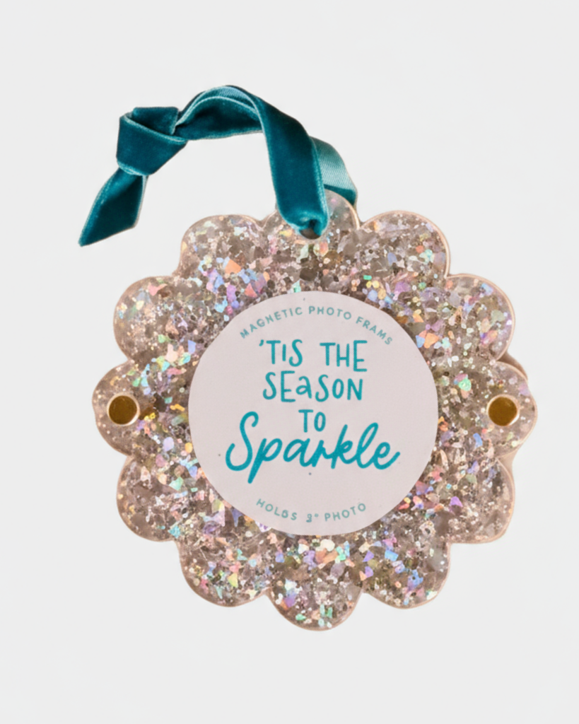 Add a touch of sparkle to your holiday with this scalloped picture frame ornament, featuring bold typography and glittery accents. It's fun, festive, and perfect for showcasing your favorite memories with a retro vibe!