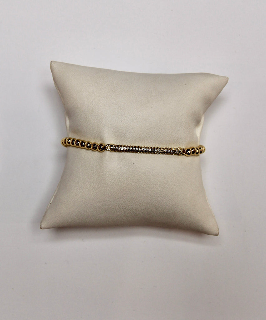 This gold beaded bracelet features a CZ bar accent. Perfect to wear alone or to add to your stack.