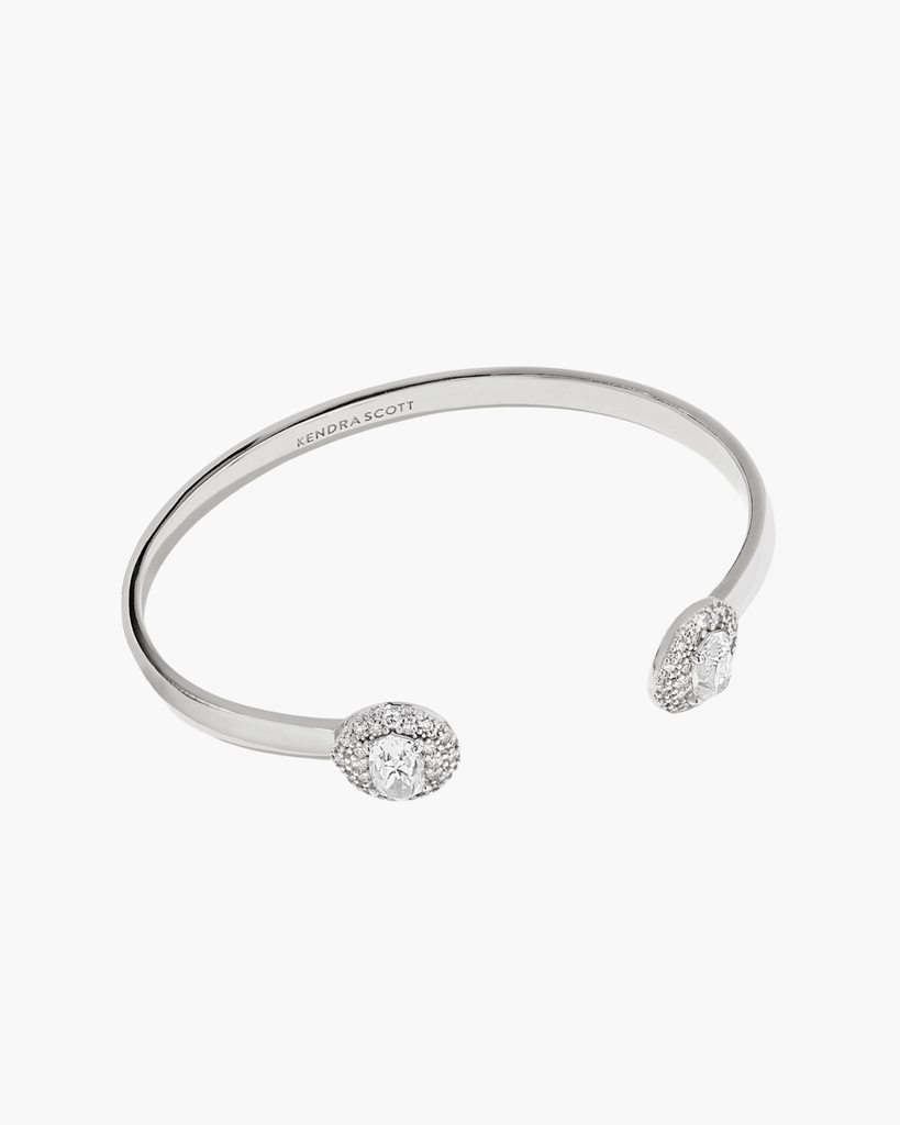 Elevate your bracelet collection with the Bella Silver Cuff Bracelet, showcasing a polished metal finish that catches the light beautifully. The striking endpieces feature custom-cut crystals in the popular Elisa shape, encircled by brilliant cubic zirconia for exceptional sparkle.