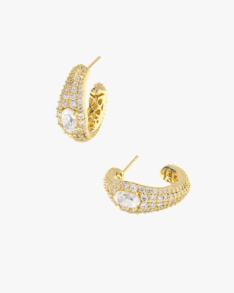 Introducing the Bella Silver Hoop Earrings, featuring a tapered design with a custom-cut crystal inspired by the Elisa shape. Enhanced by sparkling pave accents and signature filigree cutouts on the back, these earrings radiate elegance from every angle.
