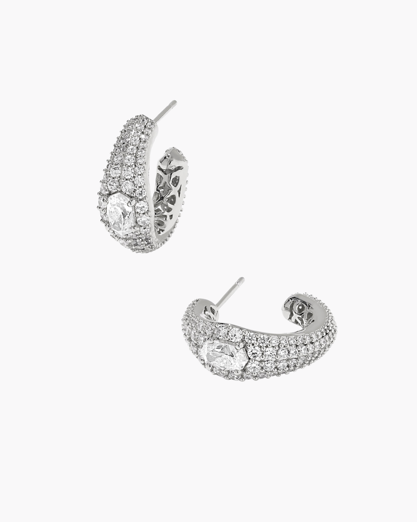 Introducing the Bella Silver Hoop Earrings, featuring a tapered design with a custom-cut crystal inspired by the Elisa shape. Enhanced by sparkling pave accents and signature filigree cutouts on the back, these earrings radiate elegance from every angle.
