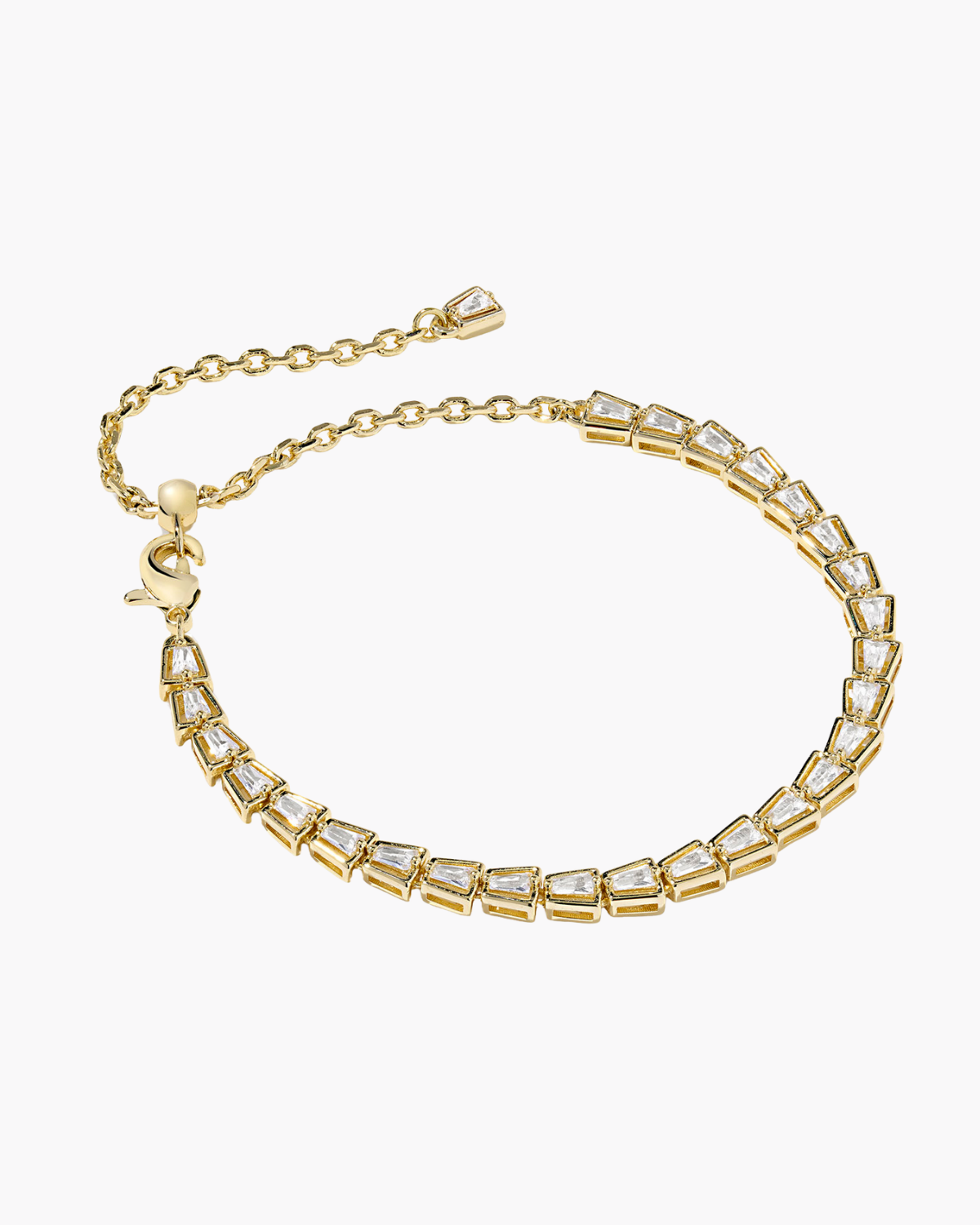 The Bella Tennis Bracelet is an essential piece, offering a modern twist on the classic silhouette with its tapered baguette cubic zirconia stones that catch the light brilliantly. For a polished finish, pair it alongside your favorite watch to create a sophisticated, layered look.