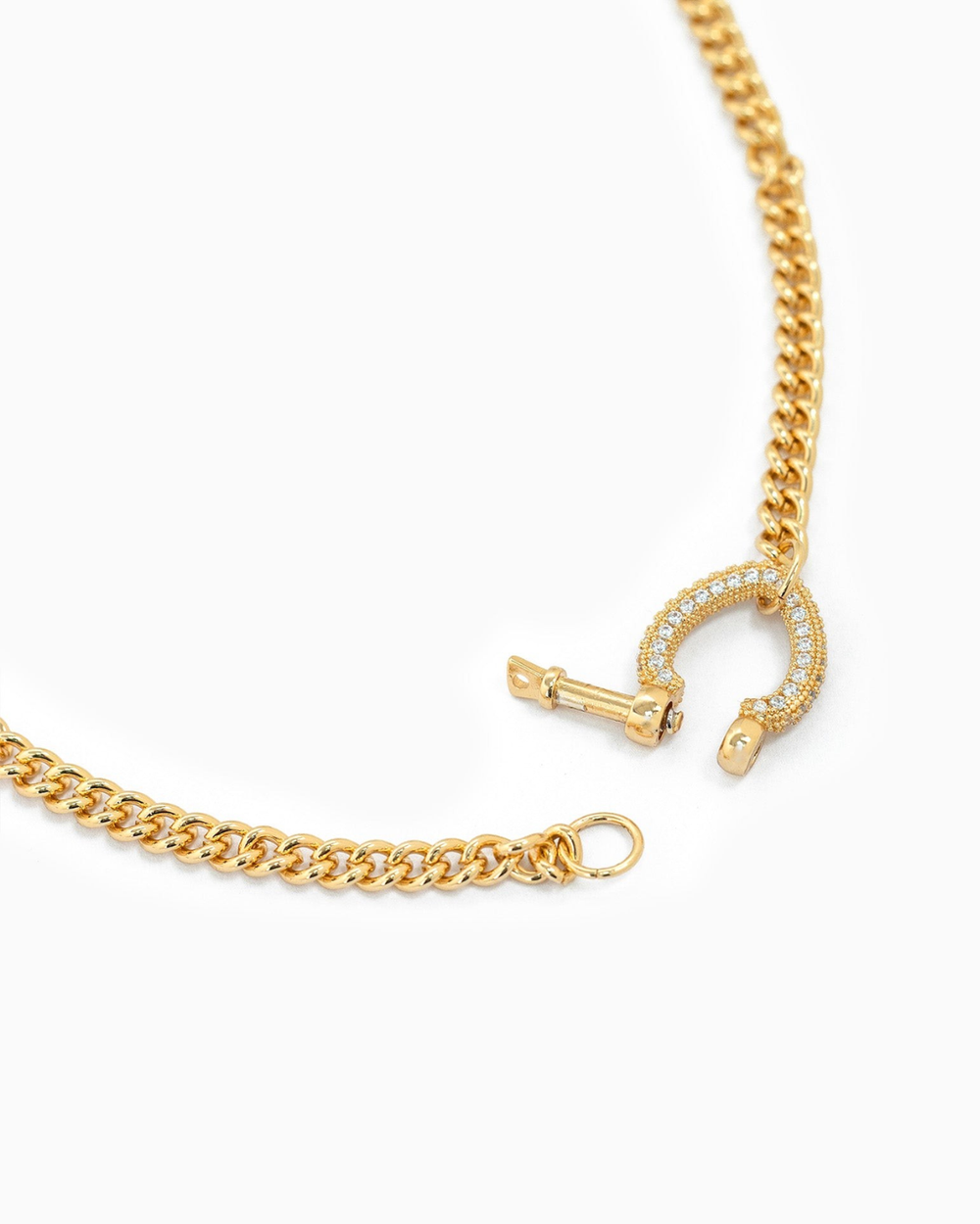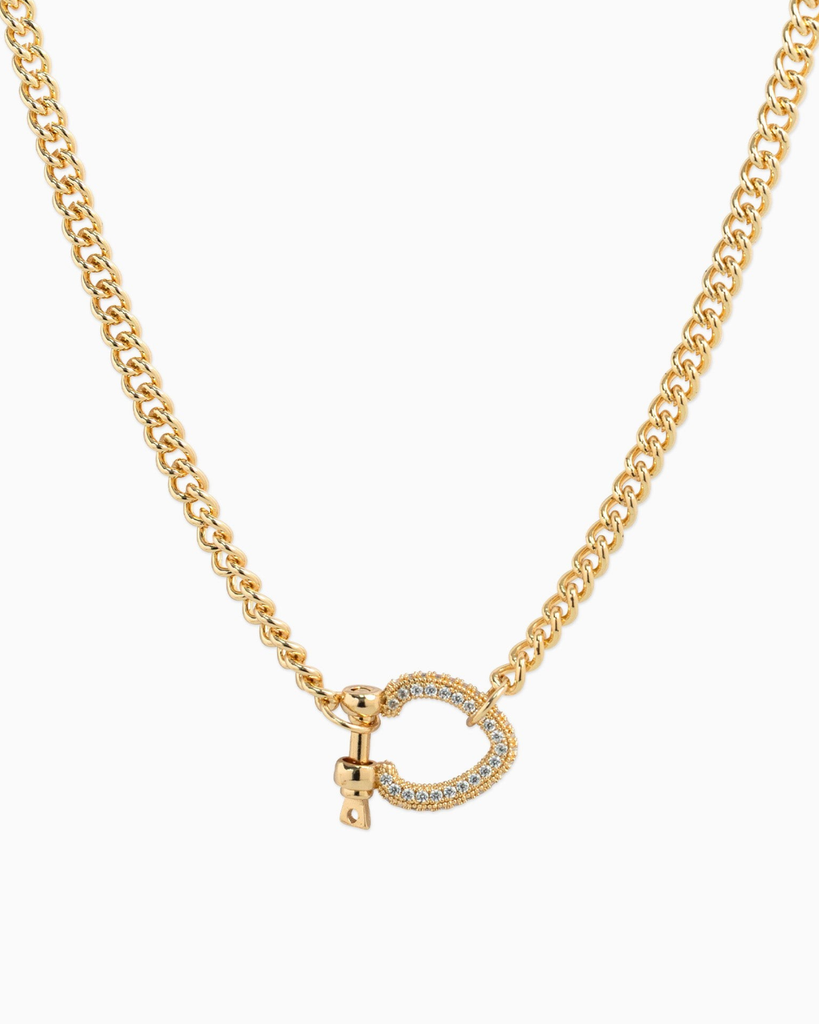 This Carabiner Necklace brings together bold western flair and a sprinkle of sparkle for a look that’s both lively and striking. With its pavé crystal horsebit pendant on a chunky gold chain, it’s just right for layering or wearing solo with a cheeky mix of glam and cowboy cool.