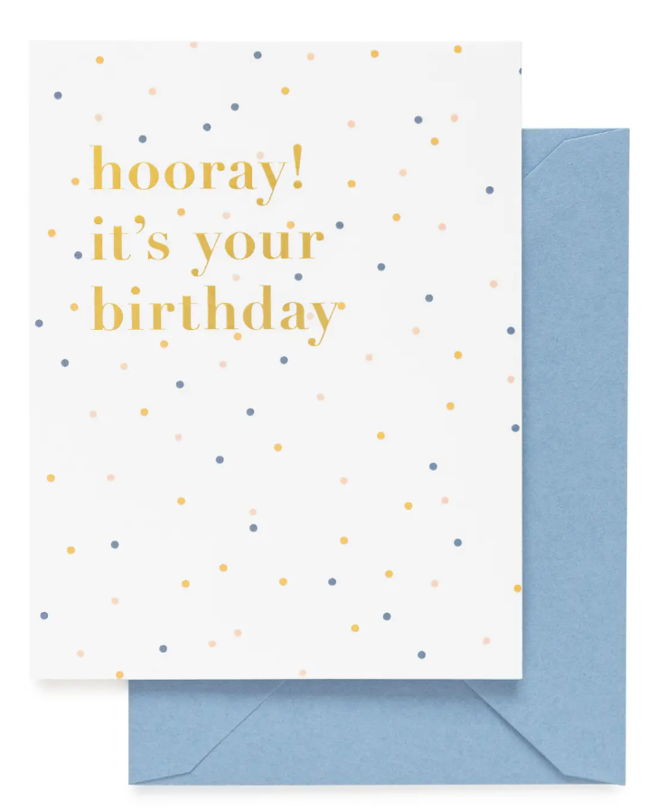 The Hooray It's Your Birthday card is letterpress printed by hand on antique machinery. Champagne foil on white paper printed with pink and blue polka dots, paired with a French blue envelope.
