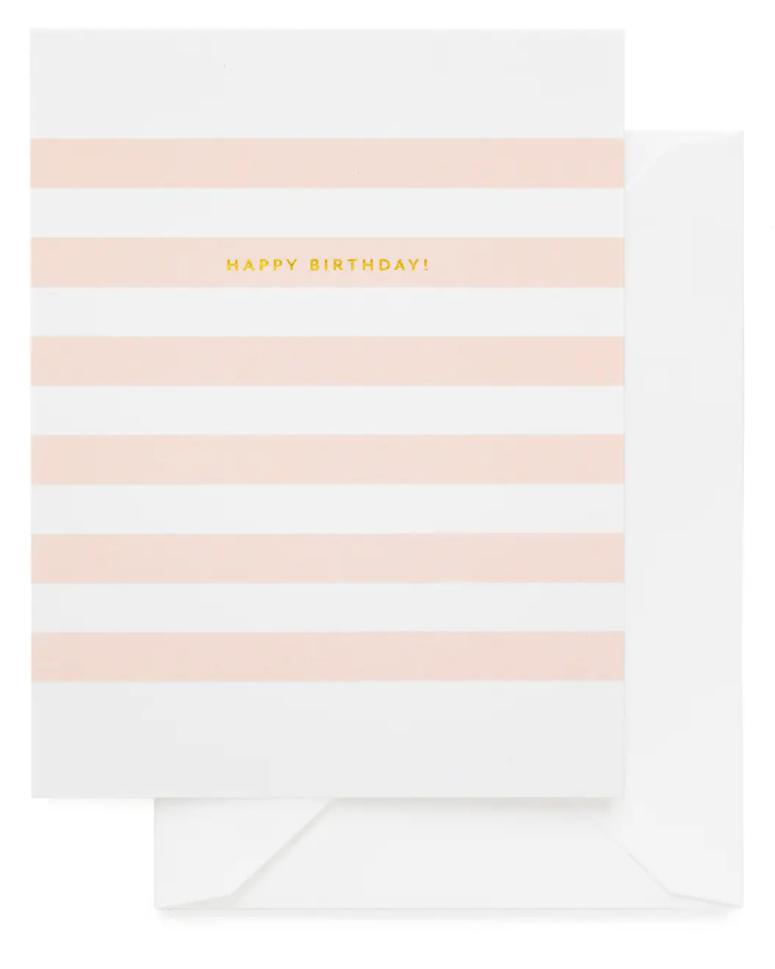 Our Preppy Stripe Birthday card is foil printed by hand on antique machinery. Gold foil on pink stripe patterned paper paired with a white envelope.