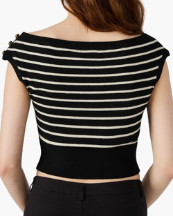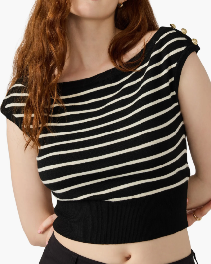 Golden etched shoulder buttons elevate this drapey cropped sweater framed by cap sleeves and solid ribbed trim.