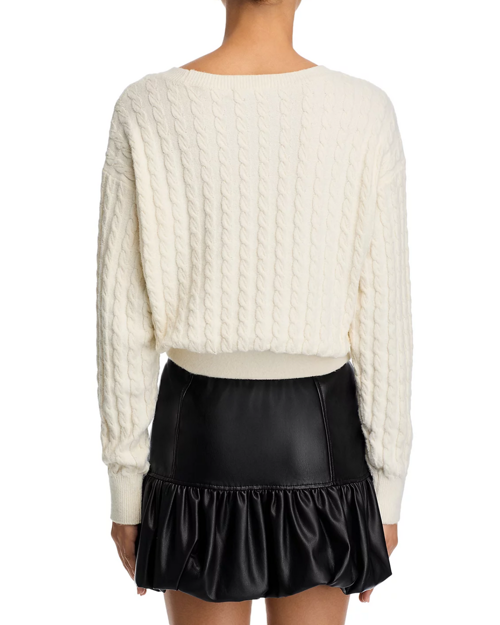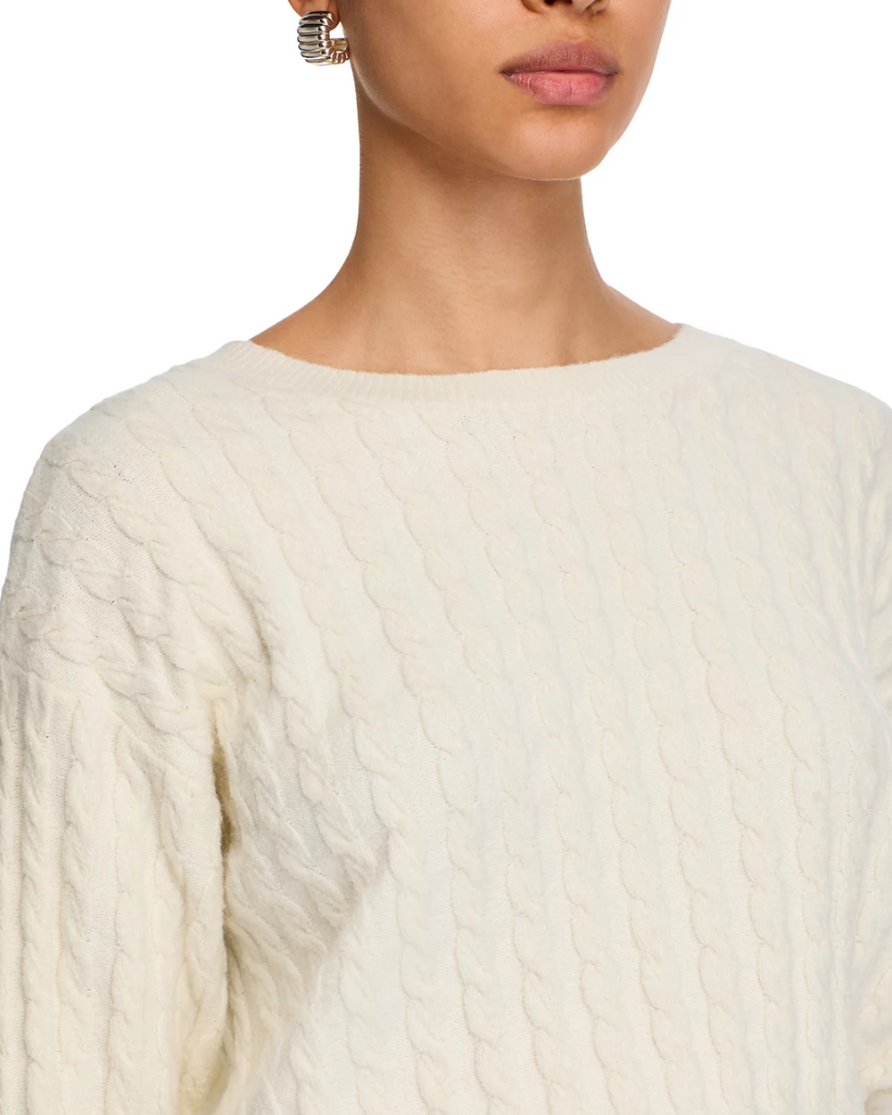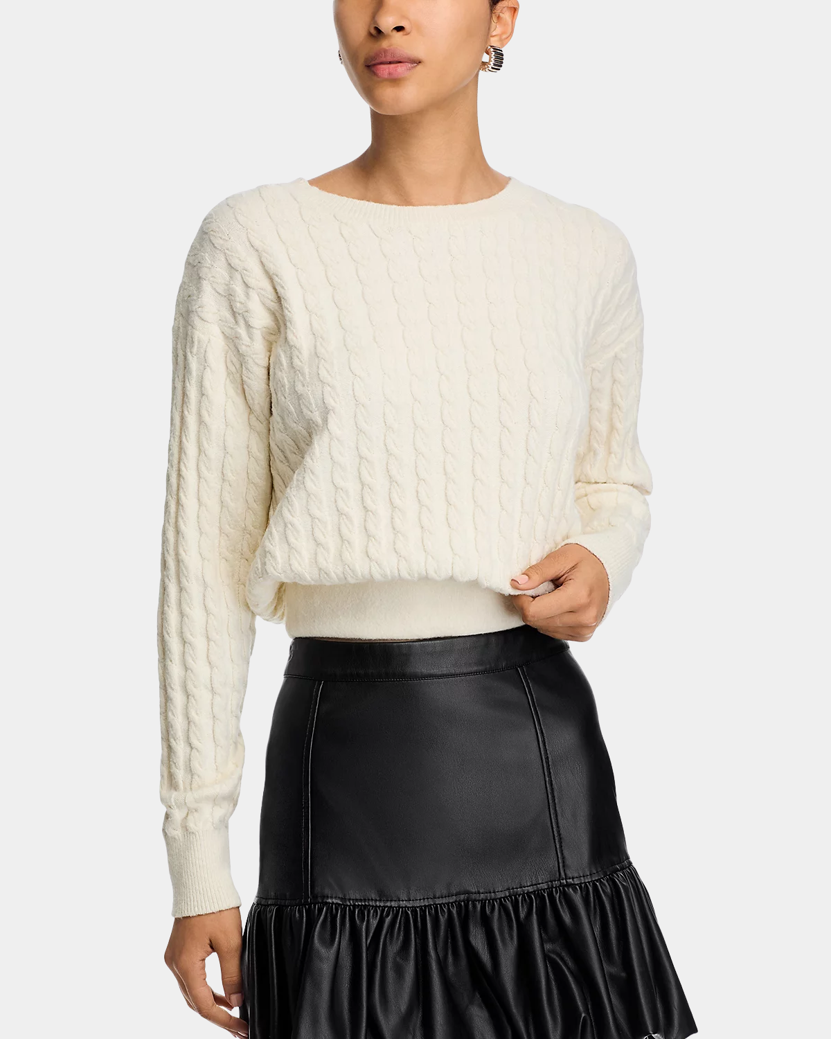 The Steve Madden Minna Sweater in Cream features a cozy cable knit design that offers both warmth and timeless style. Its versatile silhouette makes it an essential layering piece for any wardrobe.