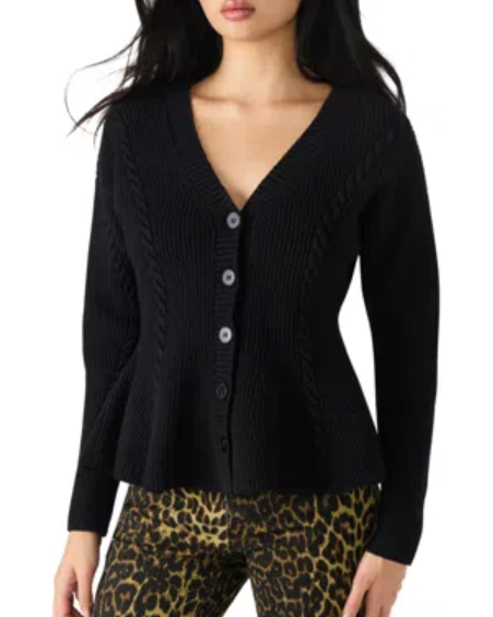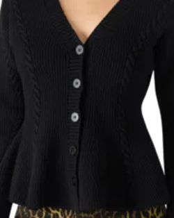 Elevate your fall wardrobe with this chic cardigan top. Crafted in cozy cable knit, this cardigan features a flattering V-neckline and long sleeves for timeless appeal. The center front button closure and elegant peplum hemline enhance its sophisticated silhouette, making it a versatile staple perfect for layering or wearing on its own.