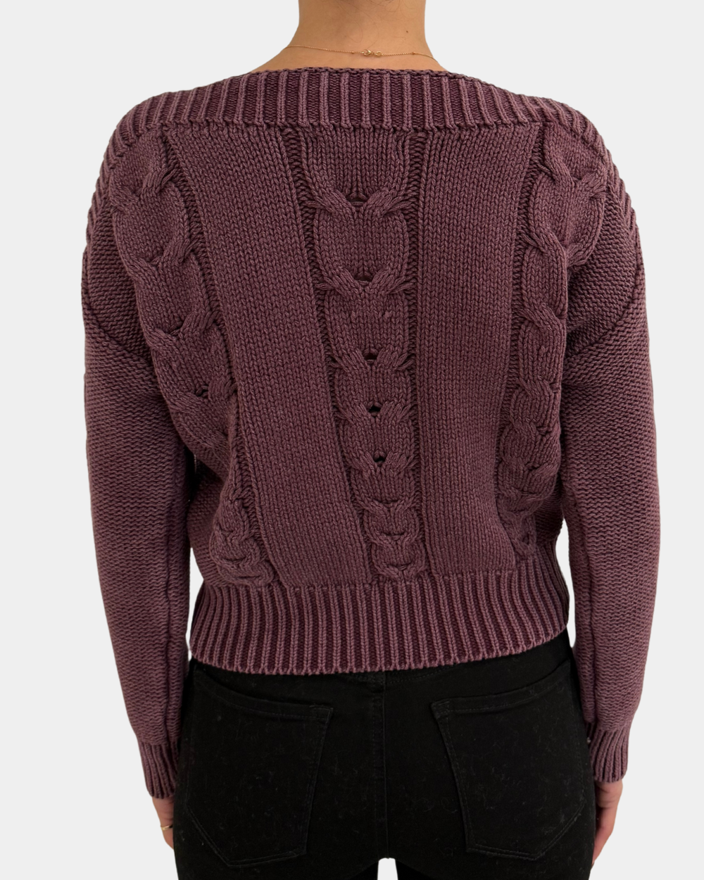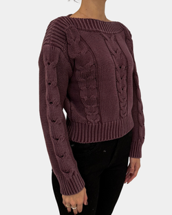 The Steve Madden Debbi Sweater in Beet features a ribbed boat neckline and a cropped, relaxed fit that offers both style and comfort.