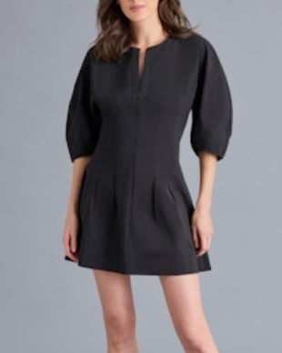 This classic little black dress features a split neckline, short sleeves and inverted pleats at the skirt. Easy to dress up or down, this dress is timeless and a classic.