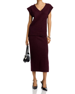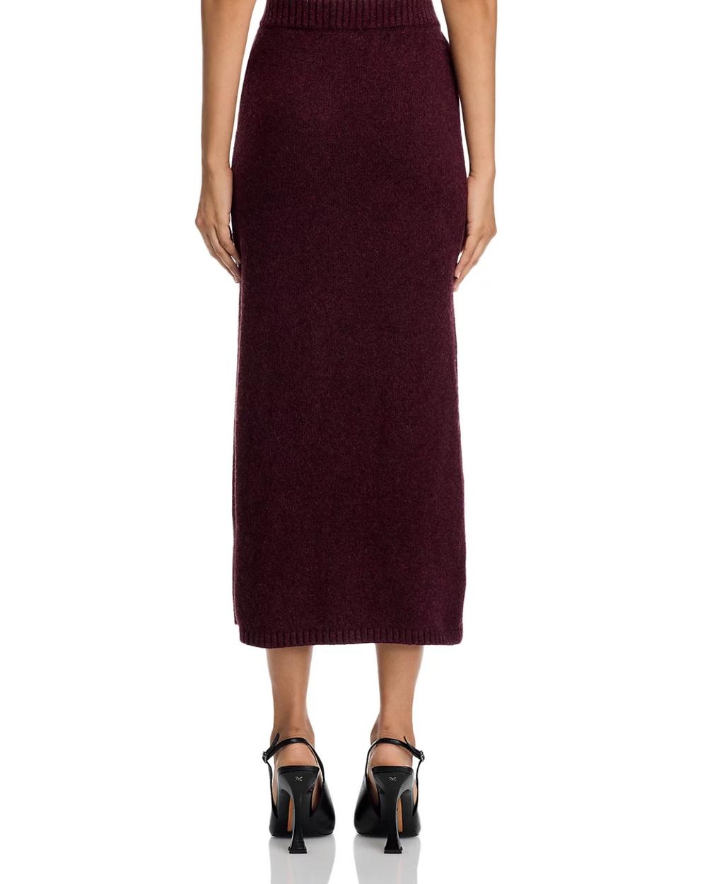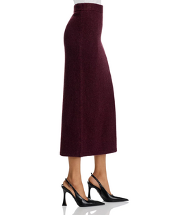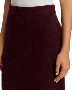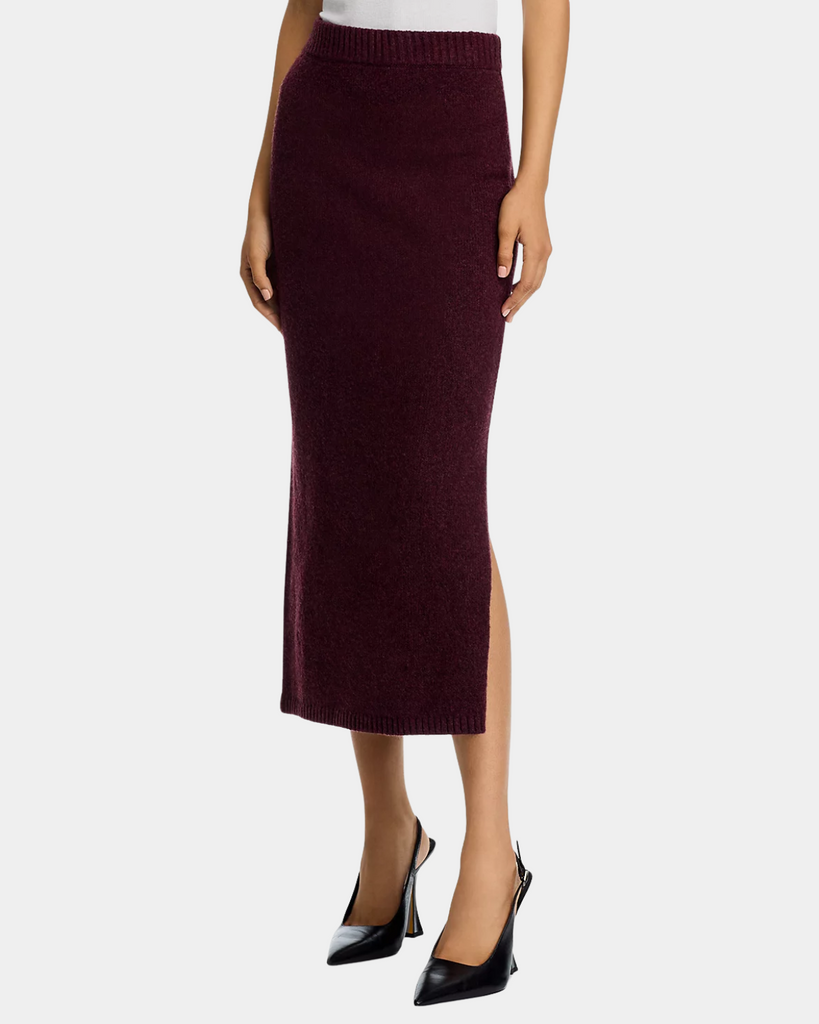The Steve Madden Remy Skirt in wine features a flattering midi length crafted from soft knit fabric, blending comfort with style. Its versatile design makes it an effortless choice for both casual and dressier occasions.