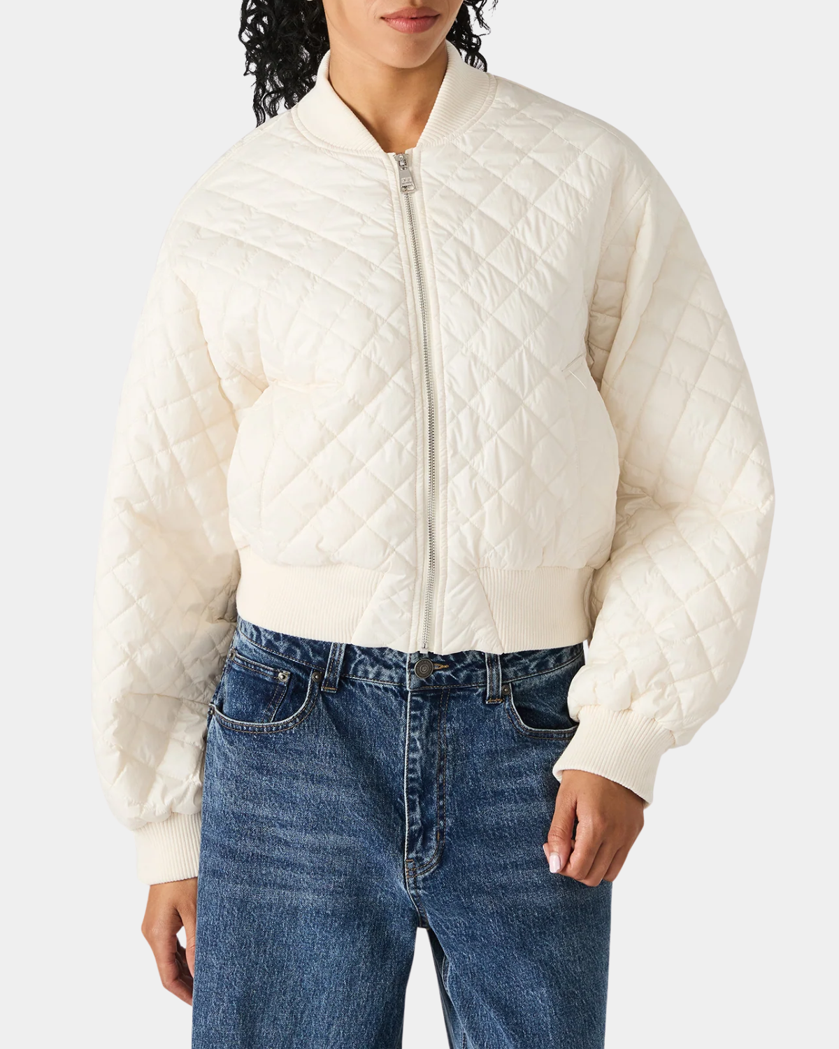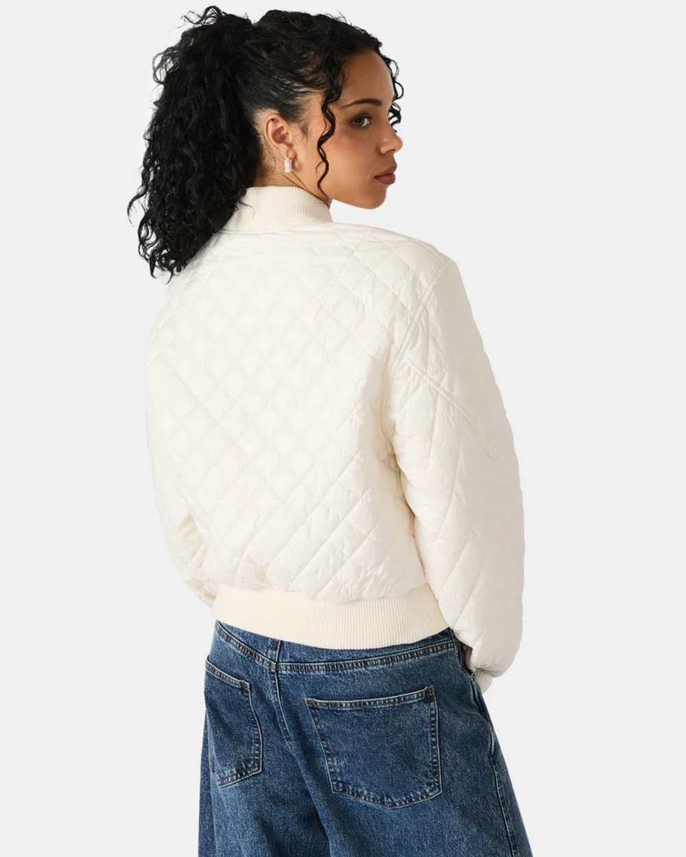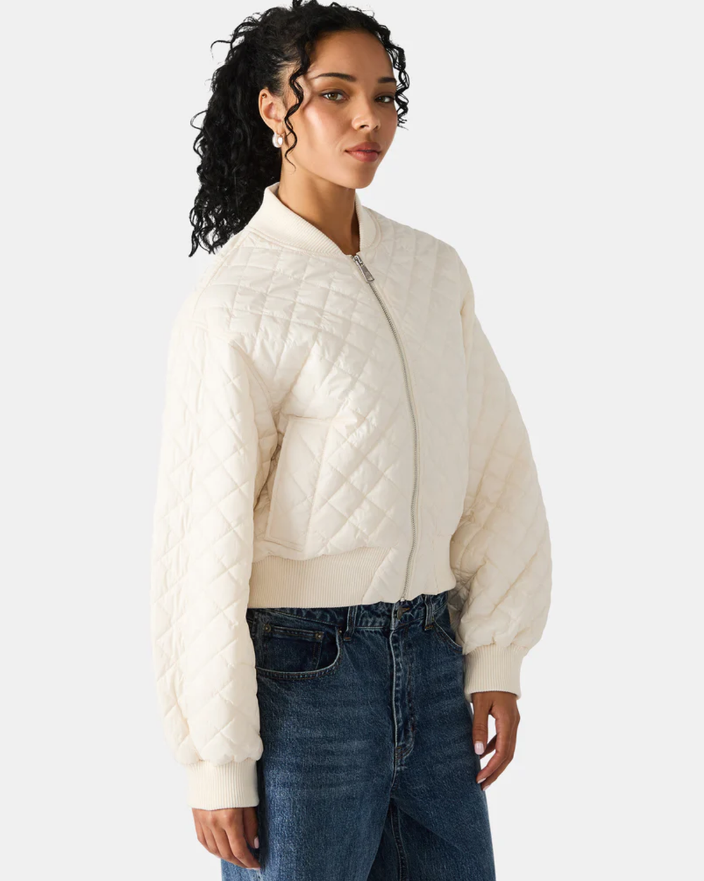 The Steve Madden Darla Jacket in Ivory offers refined quilted construction with a streamlined zip-up design. Its lightweight insulation and structured fit layer effortlessly over basics or dresses, making it ideal for transitional weather. A wardrobe staple that balances texture with understated elegance.