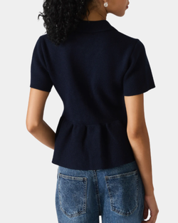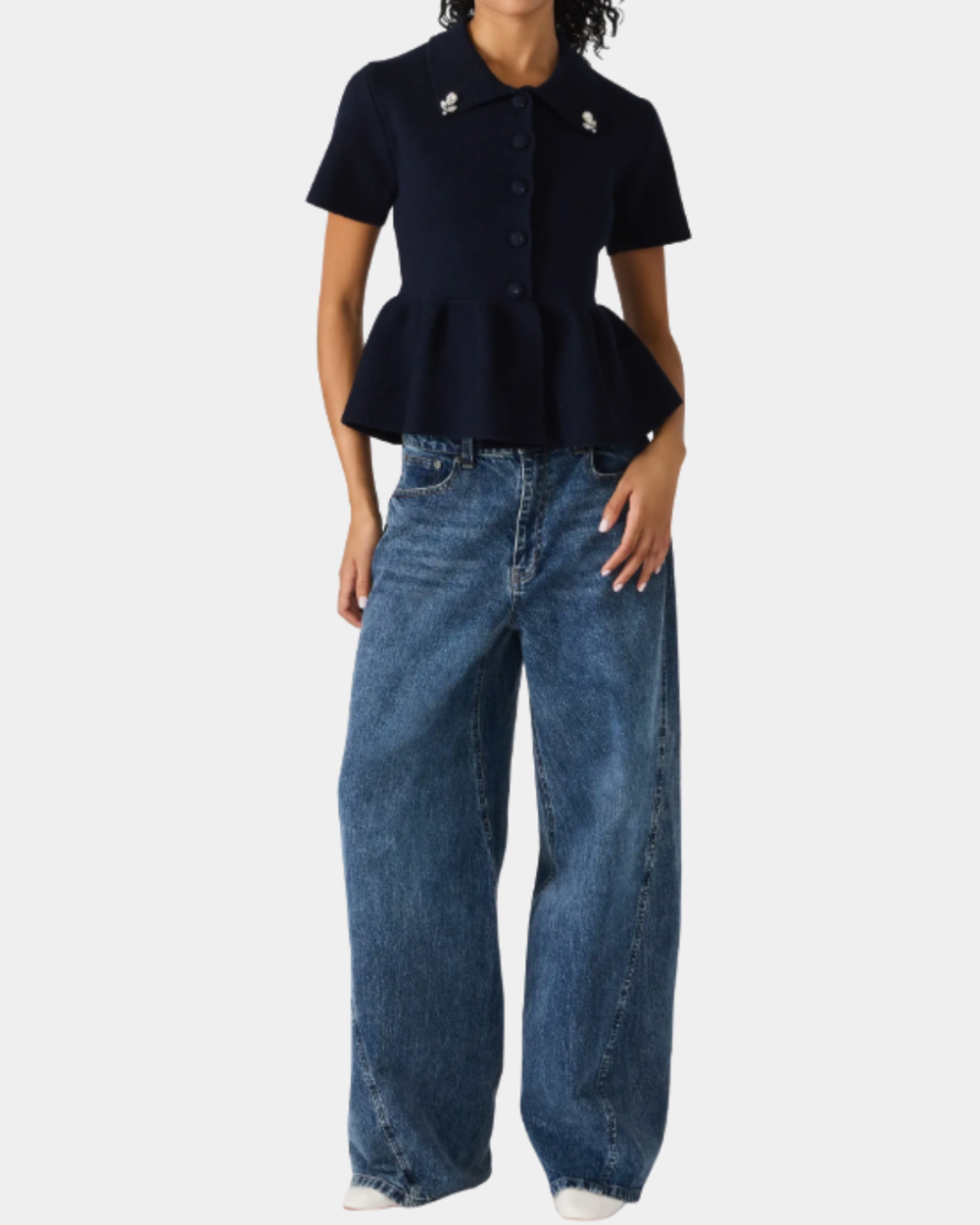The Steve Madden Roxanna Top in Marine combines timeless elegance with modern sparkle. Faceted faux gems adorn this fitted knit top, while a playful peplum hem delivers vintage-inspired charm and sophistication.