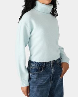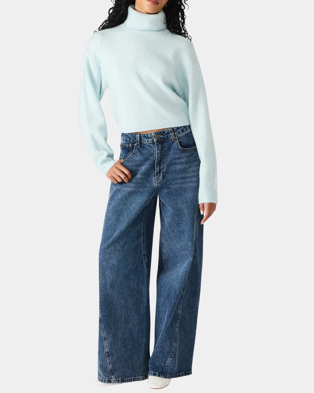This Steve Madden Raegann Sweater features a classic turtleneck and long sleeves in a serene powder blue shade, offering understated elegance and layering versatility.