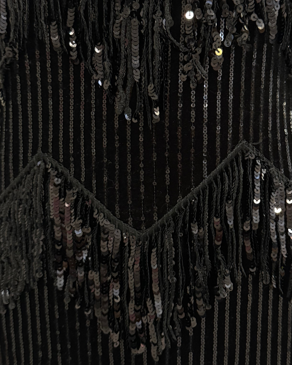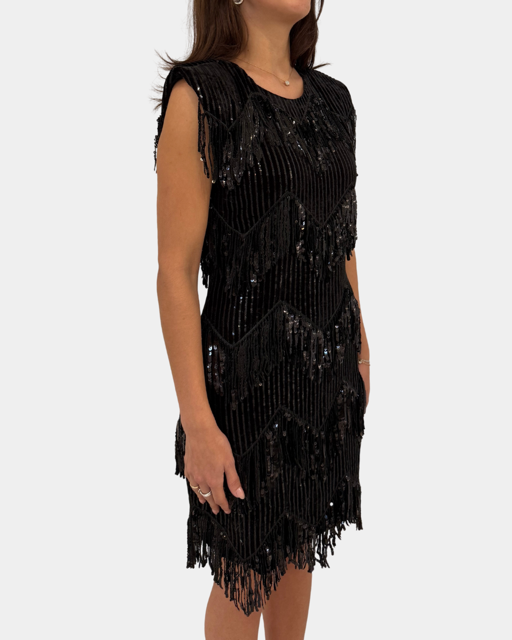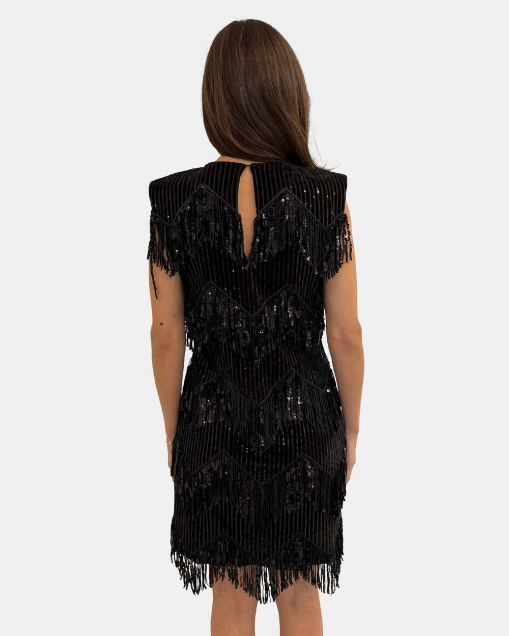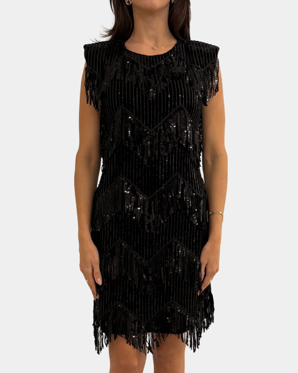 The Steve Madden Astoria Dress delivers understated elegance in a sleeveless mini silhouette. Its refined form-fitting cut, accented with subtle sparkle and fringe detailing, creates an effortlessly polished look that leaves a lasting impression.