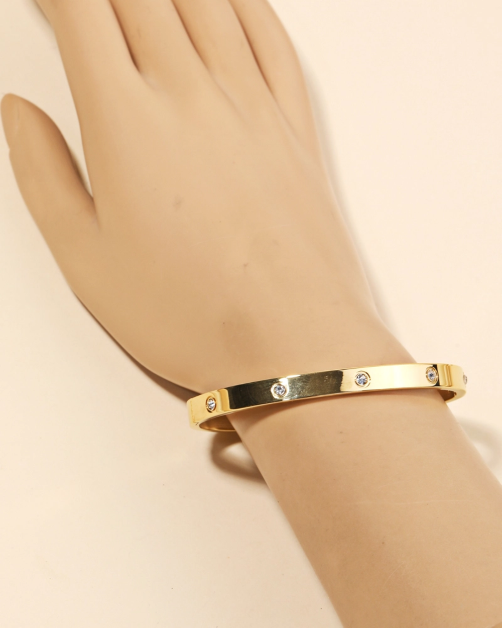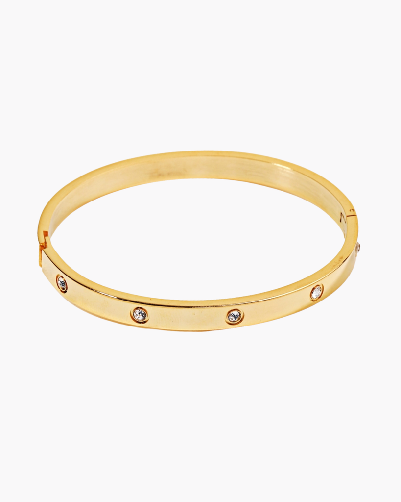 This elegant gold bangle bracelet, adorned with shimmering rhinestones, is the perfect accessory for polished business casual and upscale occasions. A timeless piece that adds refined sparkle to any ensemble.