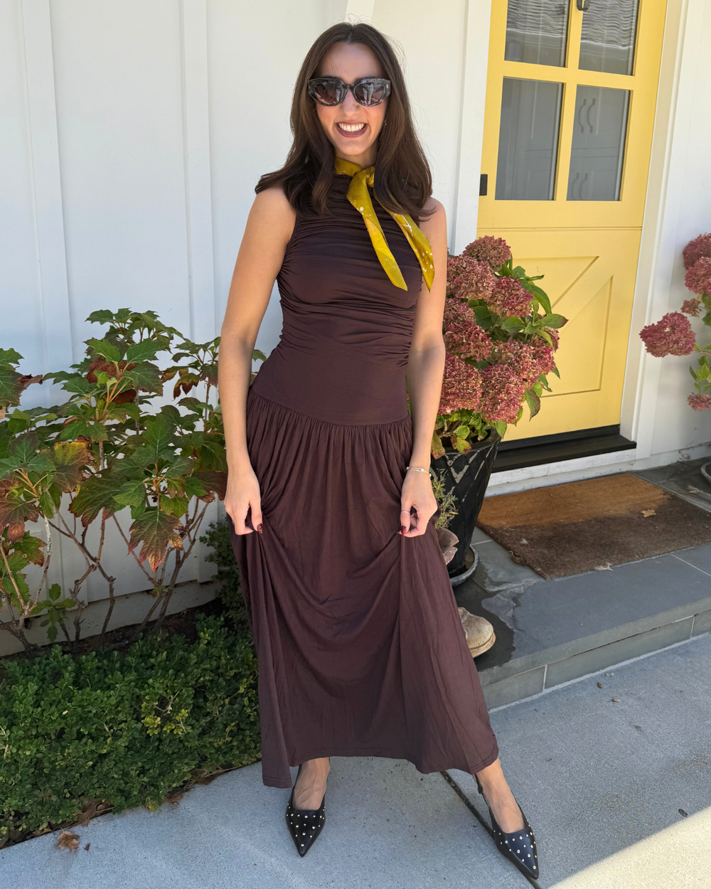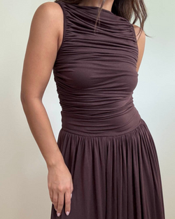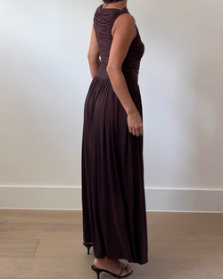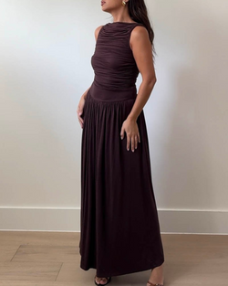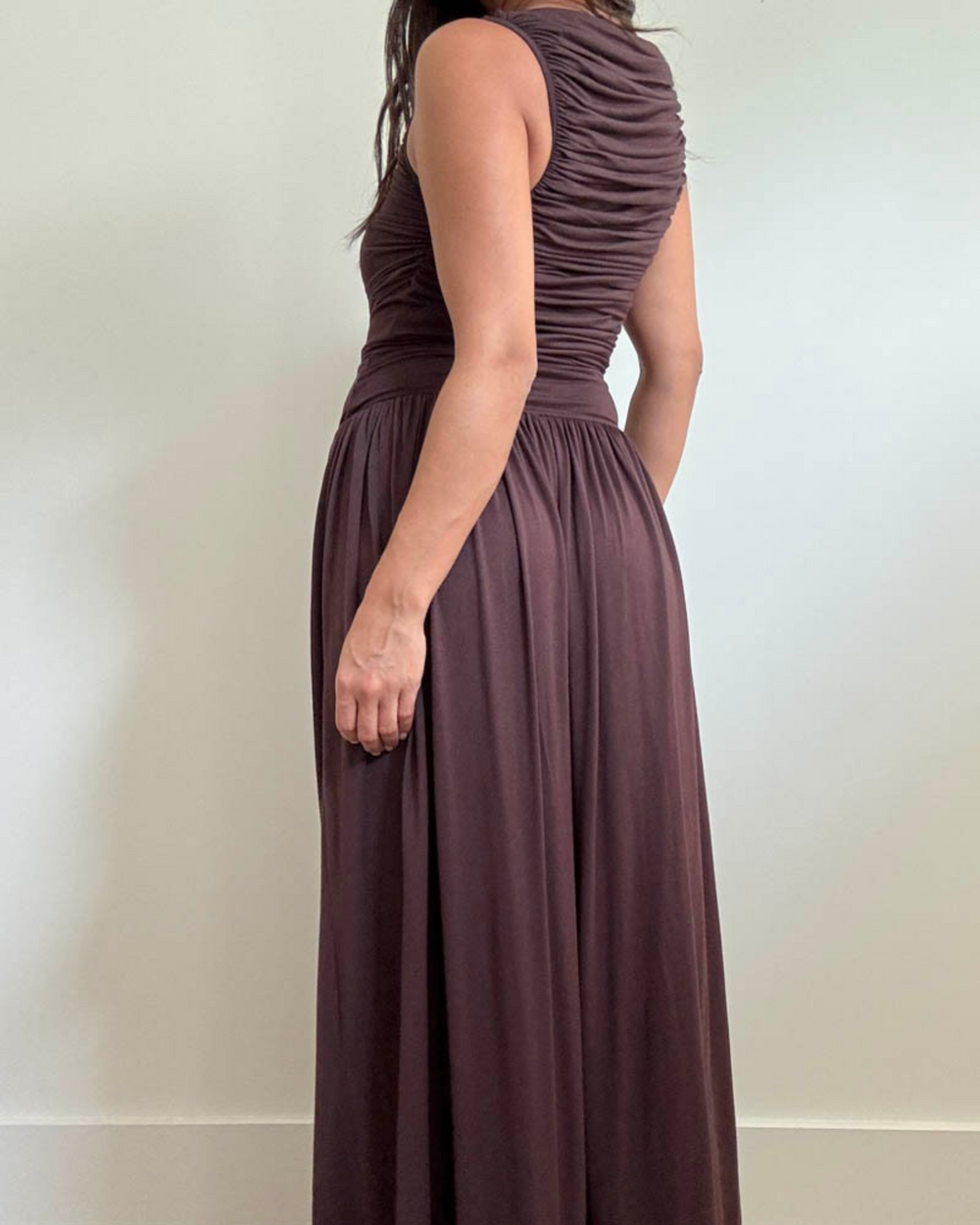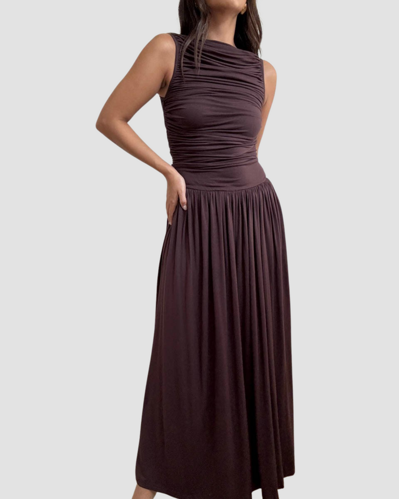 This dress presents a sleek boat neckline and sleeveless design for a refined, modern silhouette. The ruched fitted bodice highlights your figure, gracefully leading to a flowing maxi flare skirt that exudes elegance.