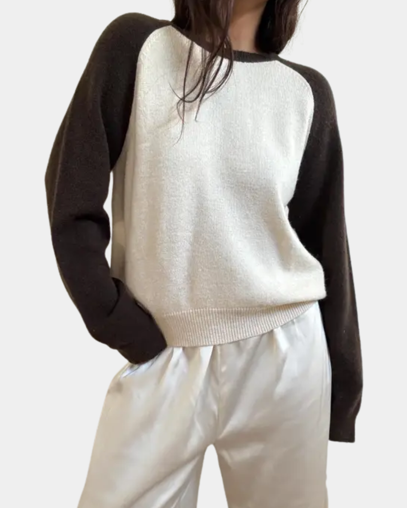 Cozy up in this charming raglan knit top that blends cream and brown in perfect harmony. The classic raglan sleeves add a vintage-inspired touch, while the soft knit fabric keeps you comfortable all day long.
