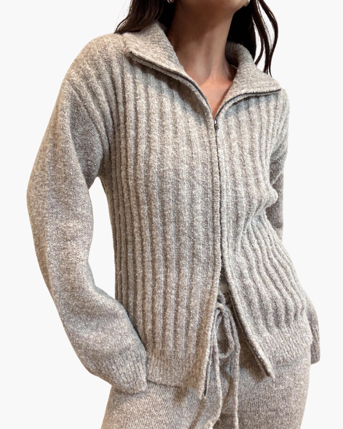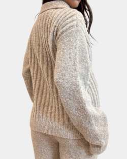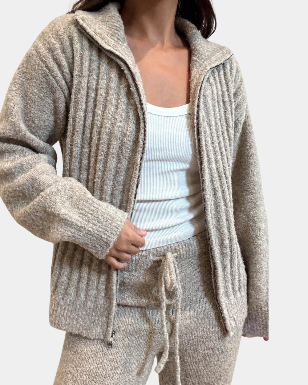 Soft boucle texture meets practical two-way zip in this wheat jacket. Stay warm and stylish on chilly days with a piece that effortlessly elevates your casual wardrobe.
