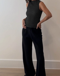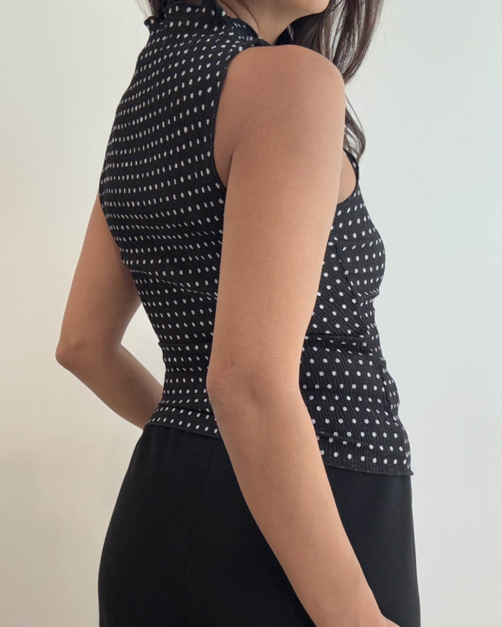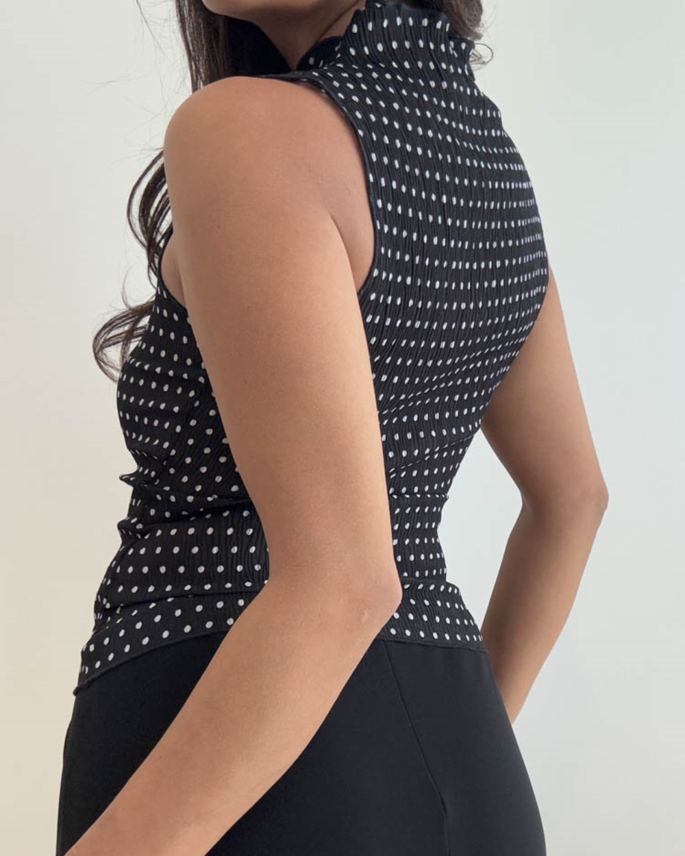 Playful polka dots meet textured elegance in this sleeveless stunner. The plissé fabric adds dimension and movement, while the high neckline keeps things sophisticated—perfect for dressing up or down.
