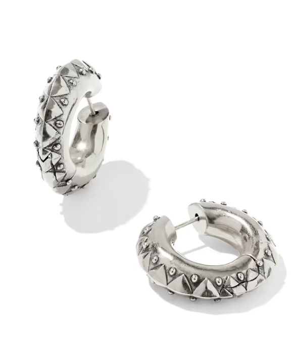 Your next must-have hoop has arrived: Meet the Catherine Vintage Silver Hoop Earrings. Our fan-favorite Mikki Hoops get a glamorous update with prismatic detailing and textural studding for extra dimension. With their artfully aged metal patina, these earrings feel like a vintage discovery that’ll have everyone asking where you found them.