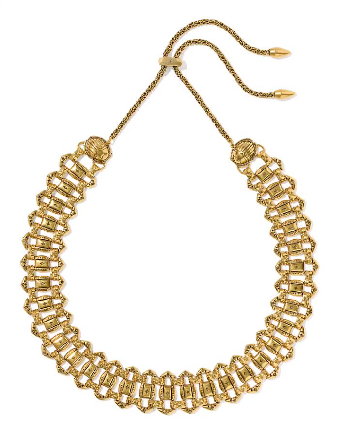 Add some refined elegance to your look with the Catherine Vintage Gold Statement Necklace. This bold collar necklace features vintage-style metal inlaid with blue lapis, exquisite etched detailing, and decorative scarab motifs on an adjustable chain that are sure to keep all eyes on you.