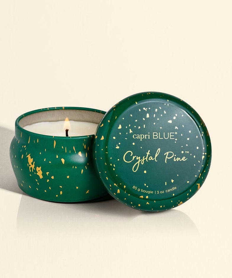 Our emerald and gold Crystal Pine Glimmer Mini Tin has the perfect blend of frosted fir, snowy woods, pine and sage. It is sure to create the ultimate holiday vibe in any space!