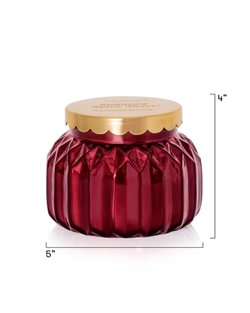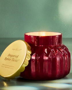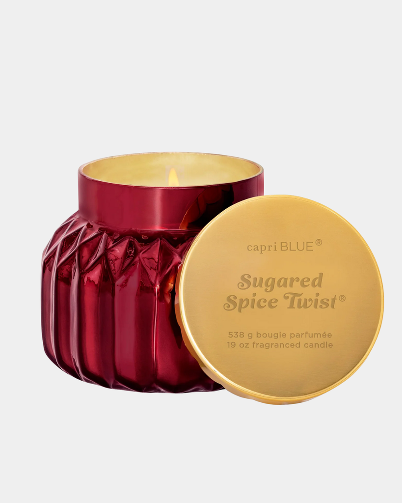 Discover Sugared Spice Twist, a seasonal blend of sugared citrus, black currant, cinnamon, and brown sugar. Housed in a ruby red gem jar with a gold lid, this candle adds a festive sparkle to any space or gift.